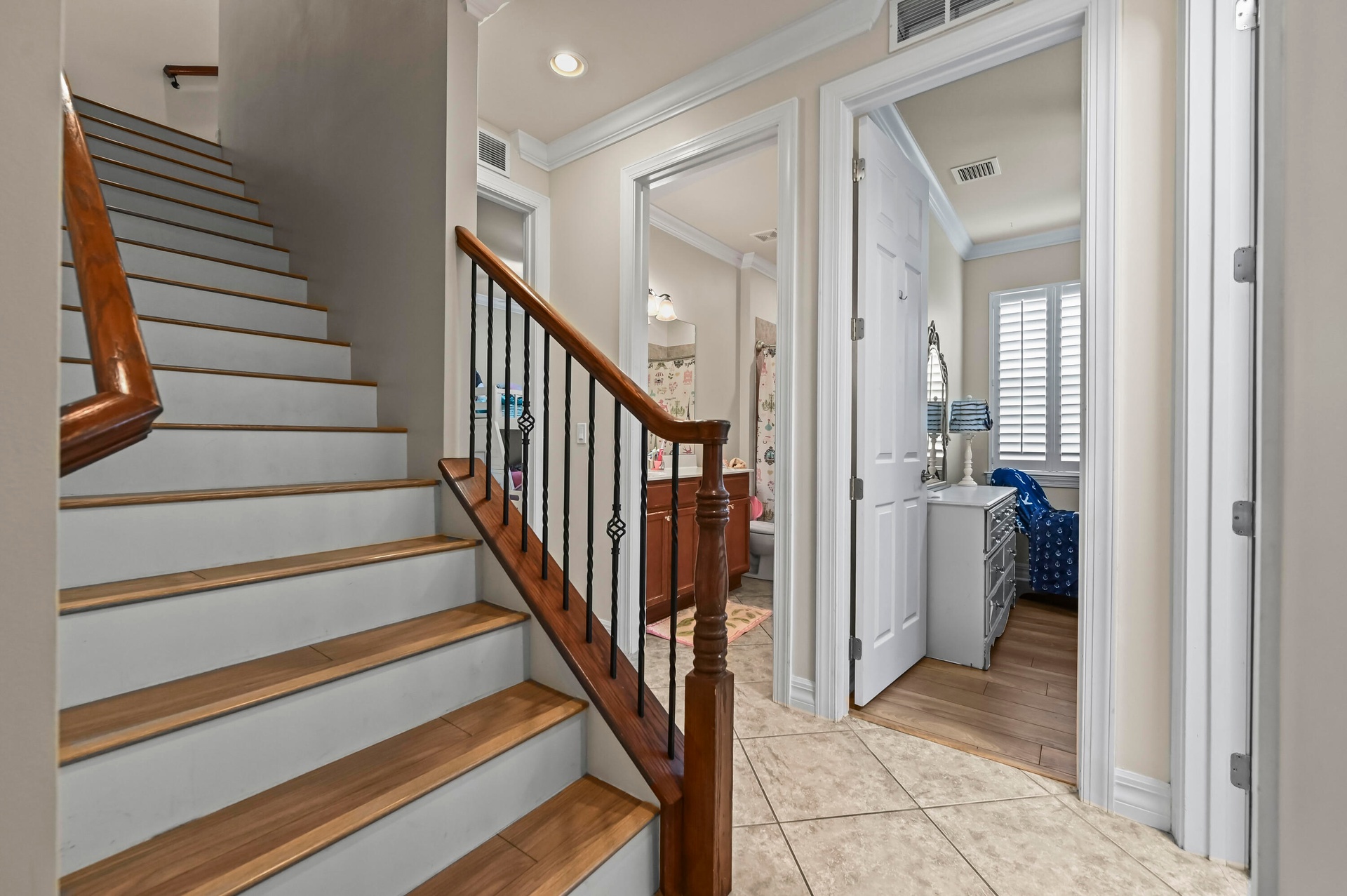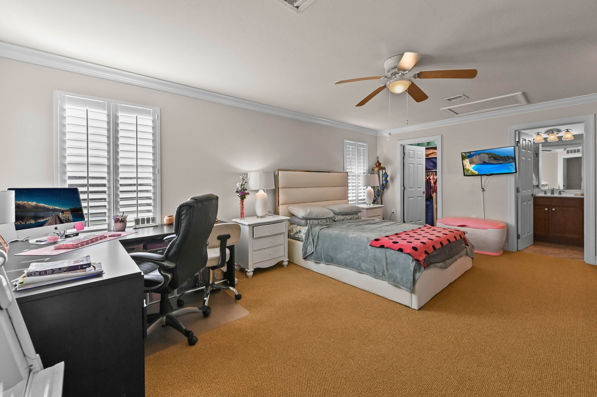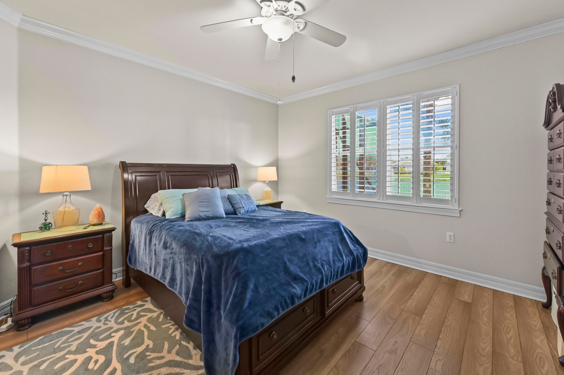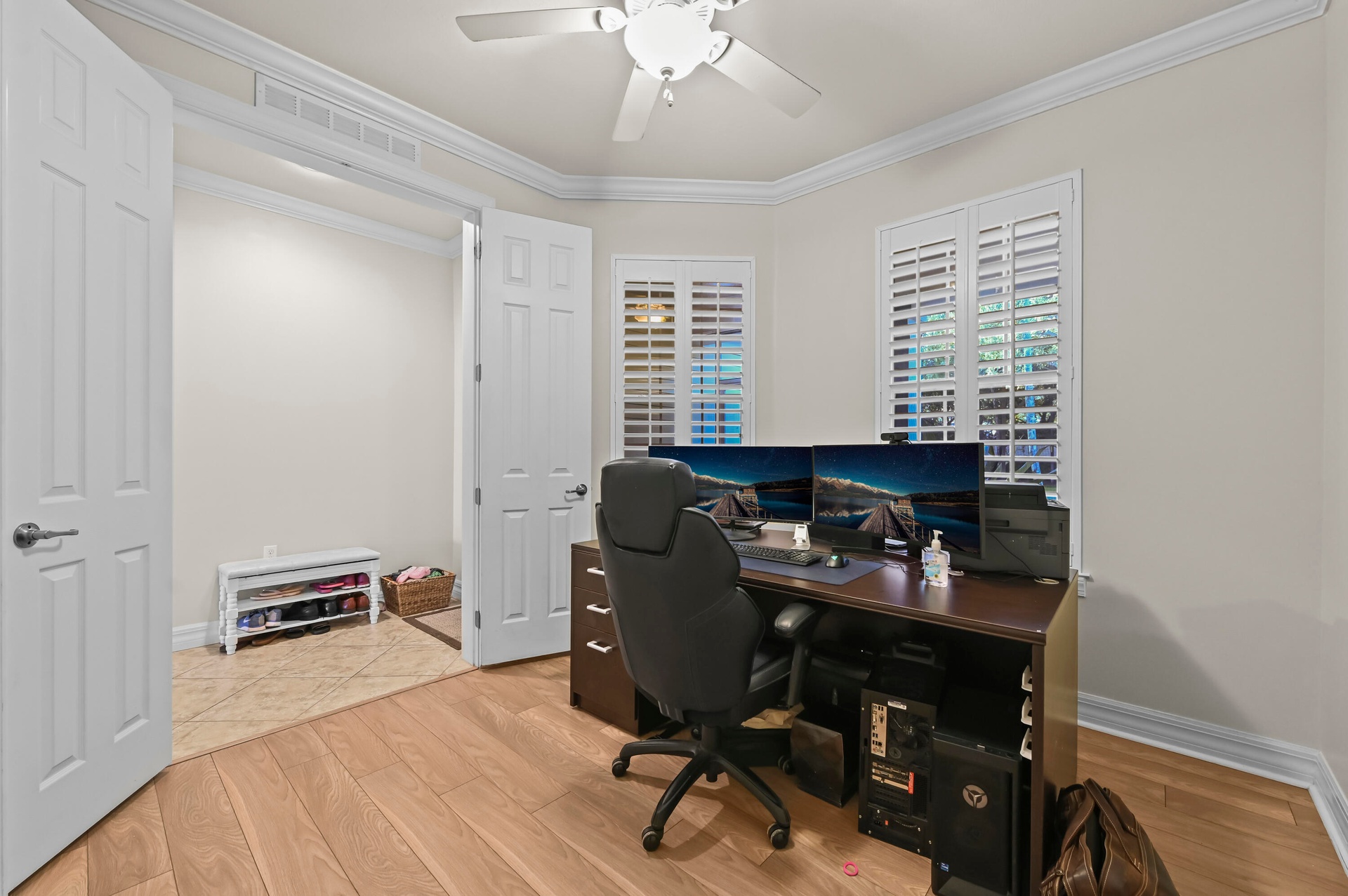 Welcome to this stunning home, perfectly situated on a serene waterfront lot within the beautifully maintained gated community, Oak Haven. The residence offers fantastic curb appeal with a paver driveway, lush landscaping, and a welcoming screened front porch. Step inside to an office that could be used as a 5th bedroom then into the bright, open-concept living area defined by neutral tile flooring, fresh paint, and elegant crown molding, flowing seamlessly into the gourmet kitchen. This central space features warm wood cabinetry, dark granite countertops, and stainless steel appliances, creating a highly functional and stylish area for both daily living and entertaining.