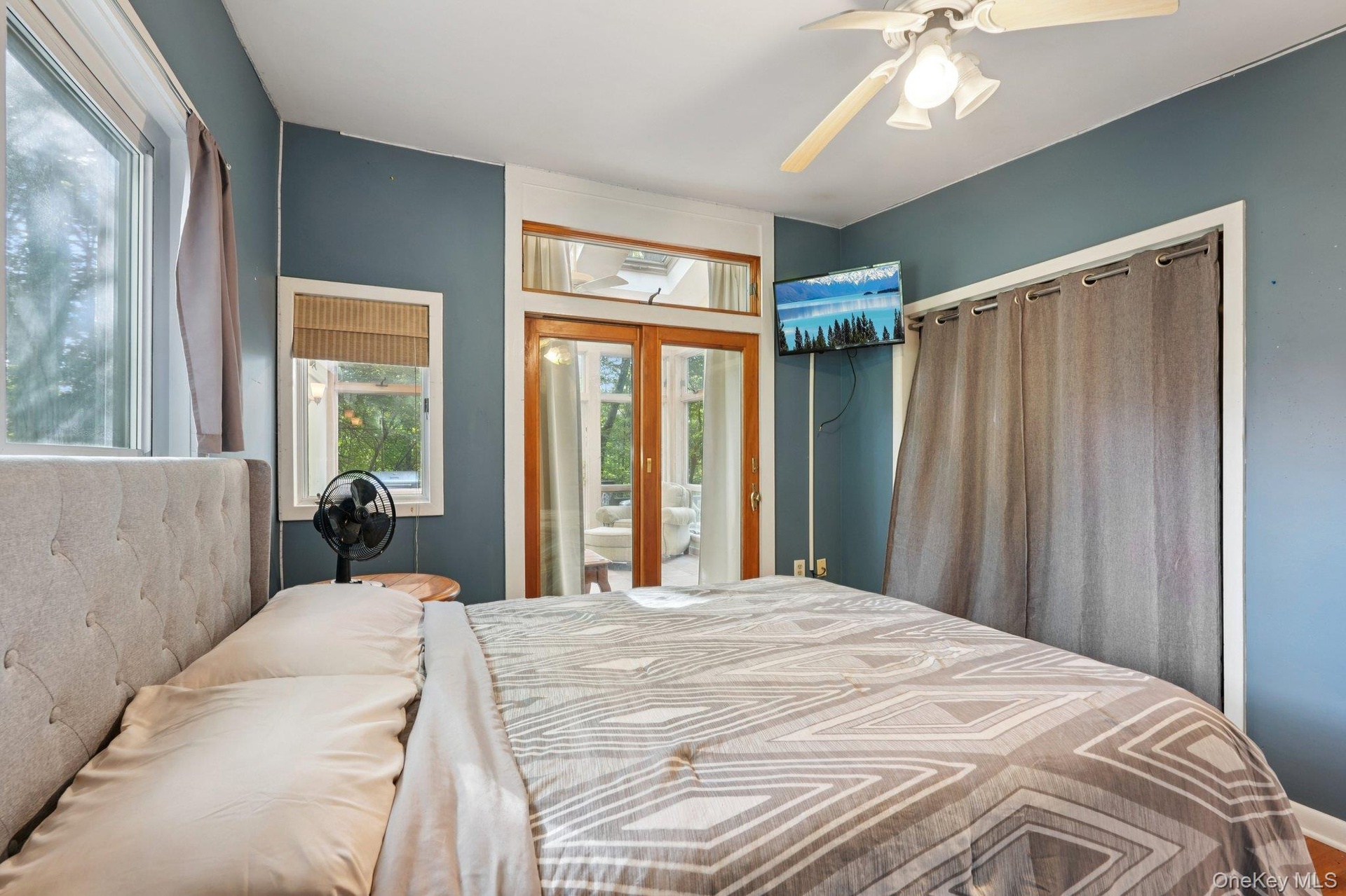 - Bedroom featuring a ceiling fan, hardwood / wood-style flooring, and access to exterior