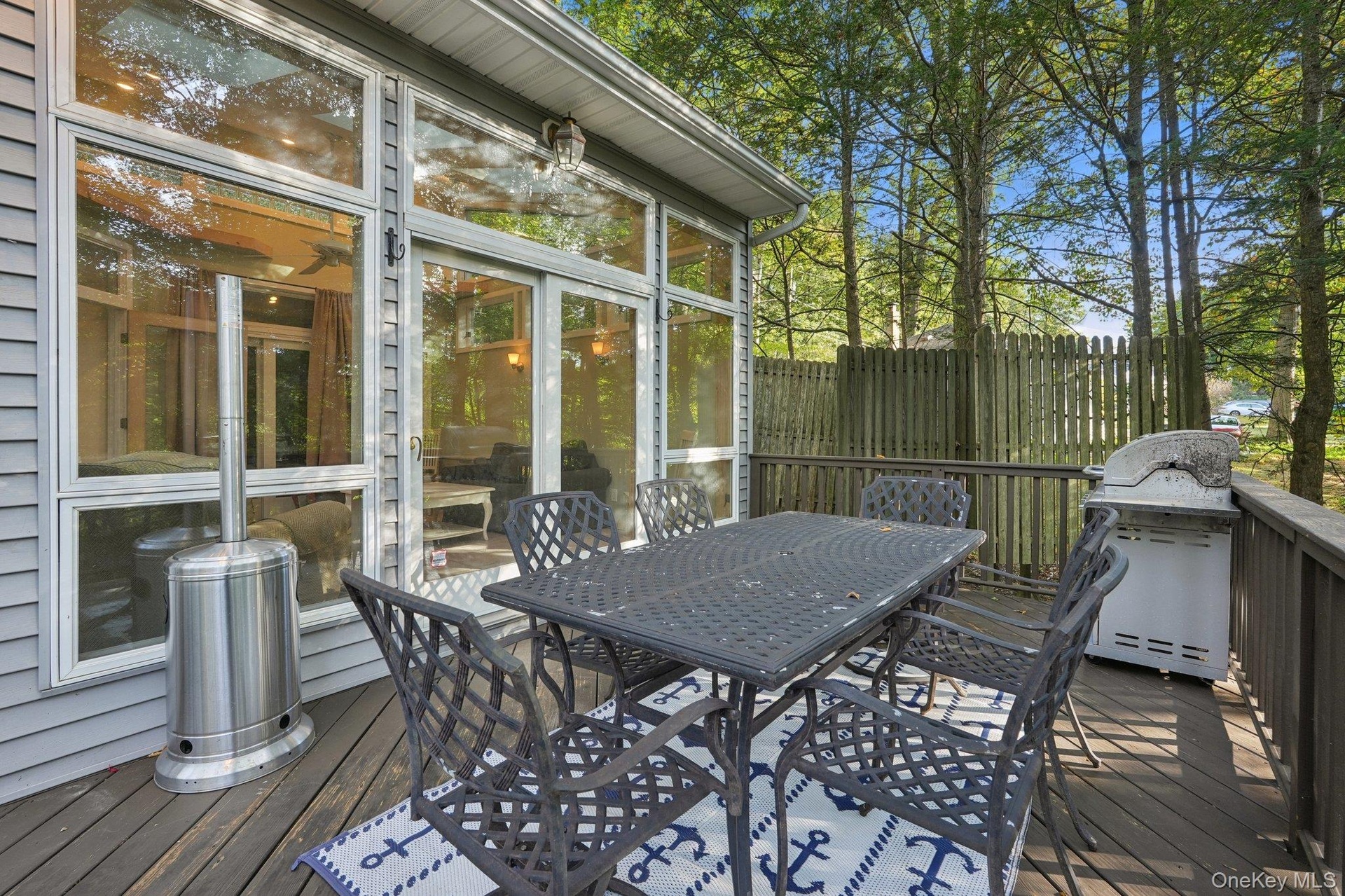 - Wooden terrace featuring a sunroom, an outdoor hangout area, and outdoor dining area