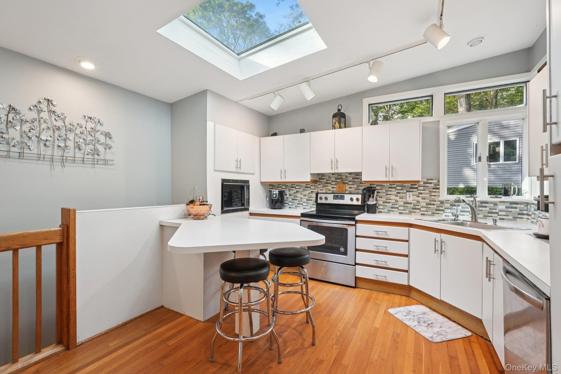 - Kitchen with white cabinetry, appliances with stainless steel finishes, light countertops, and a breakfast bar