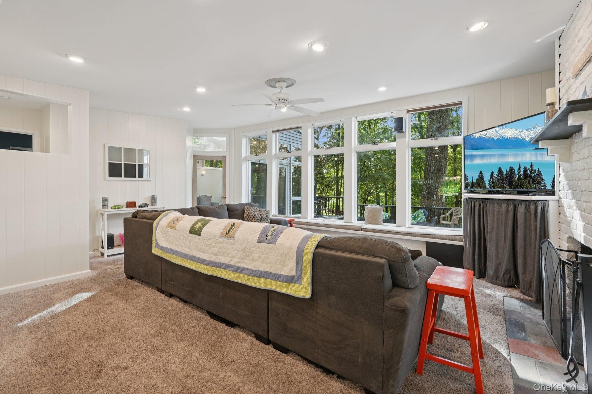 - Living area featuring carpet, a ceiling fan, recessed lighting, wood walls, and a fireplace