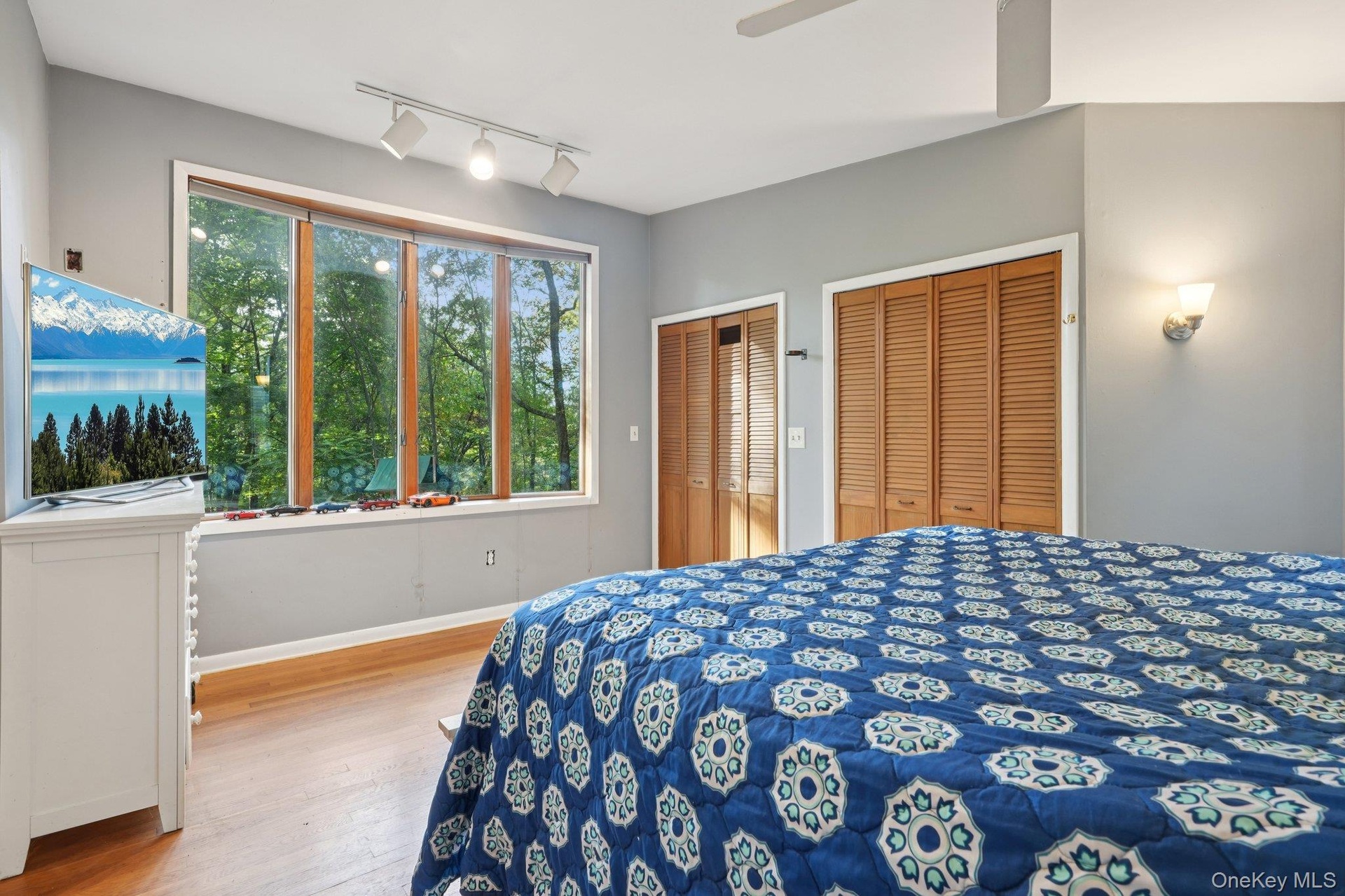 - Bedroom featuring multiple closets, wood finished floors, a ceiling fan, and track lighting