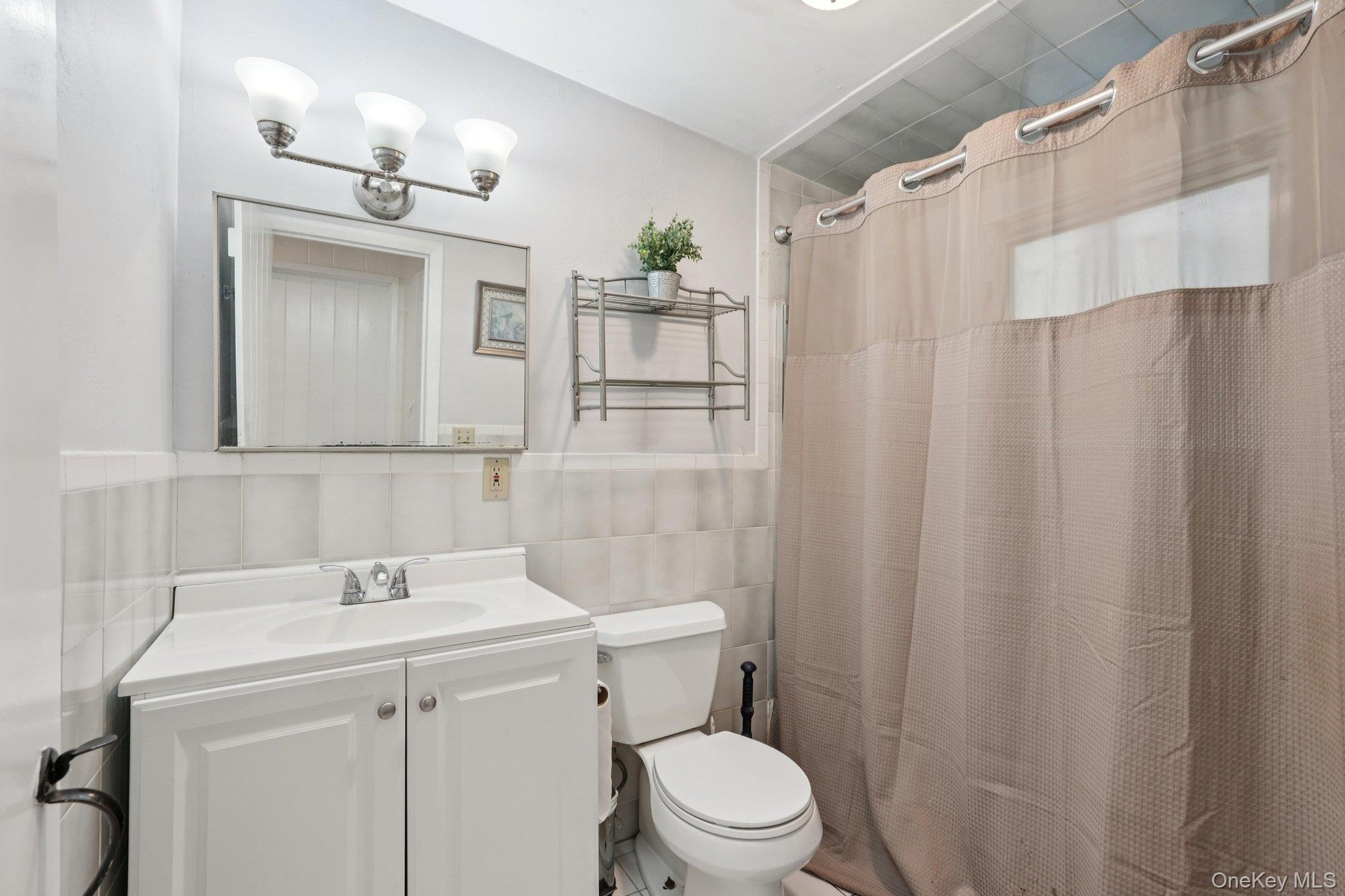 - Bathroom with tile walls, vanity, and a shower with curtain