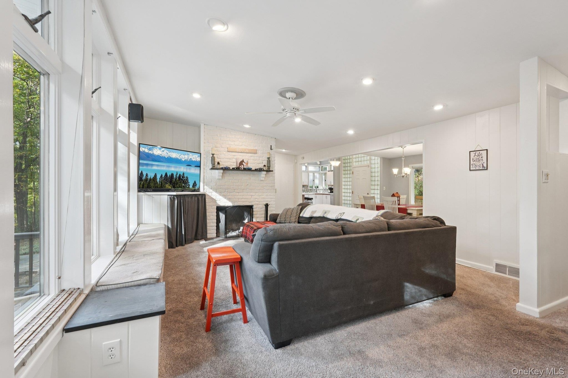 - Living room featuring carpet, a brick fireplace, a ceiling fan, recessed lighting, and a chandelier