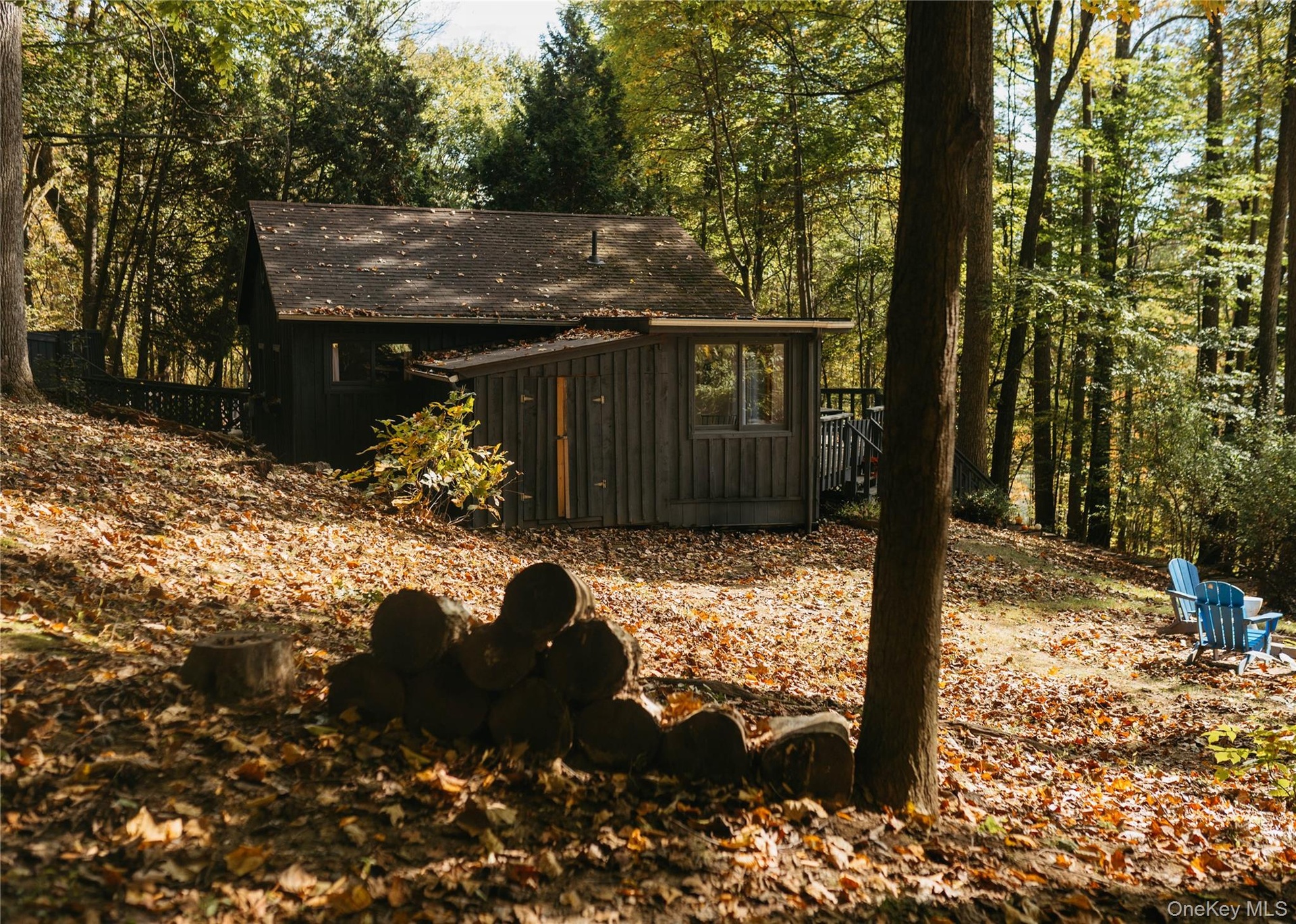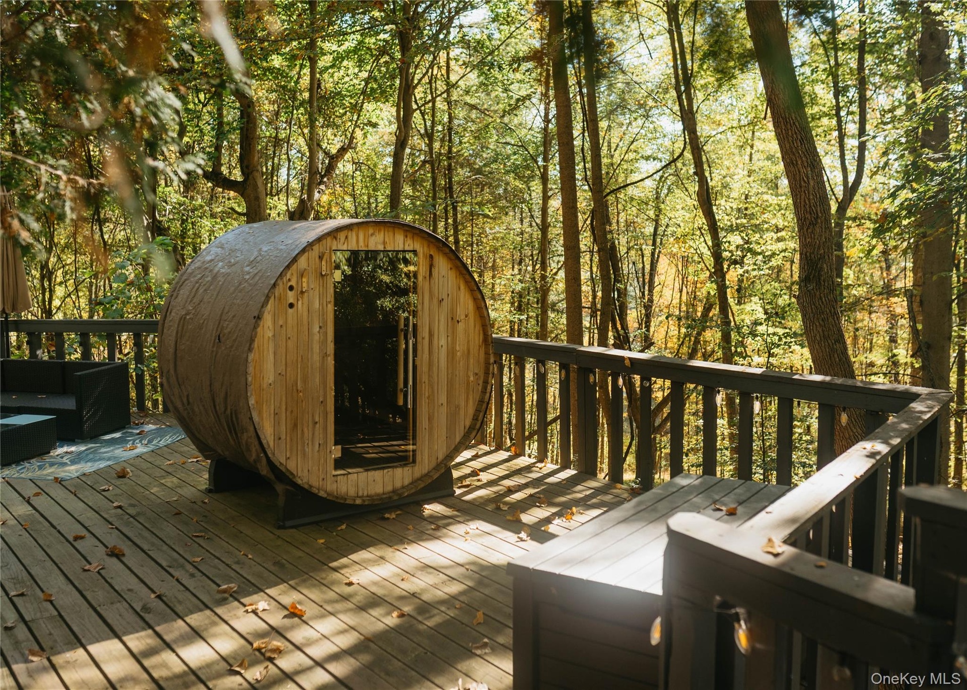 Tucked away on 15.25 wooded acres, this rustic Kerhonkson retreat perfectly balances country charm with resort-style living. The two-bedroom cottage with a loft features an updated kitchen, dining room, and a cozy living area anchored by a woodstove—warm, simple, and full of character. Outside, a wraparound deck leads to the pool, sauna, firepit, and full-size tennis court for endless summer days. Wander the private trails through the woods to Mill Brook Creek, where you can slow down and reconnect with nature. Three parcels total offer room to expand or create a larger compound—an idyllic Hudson Valley getaway with space to dream.