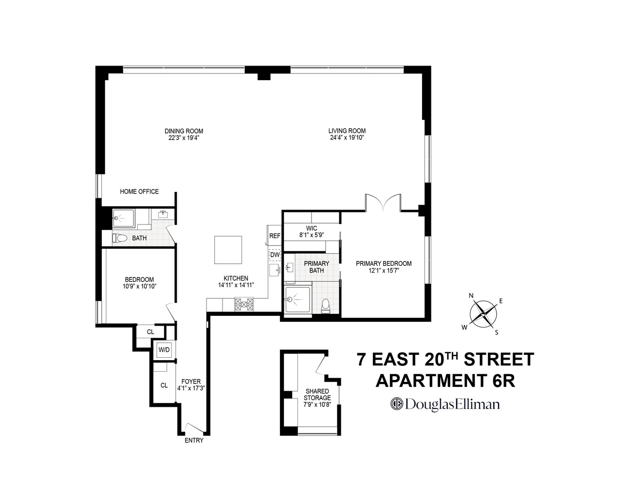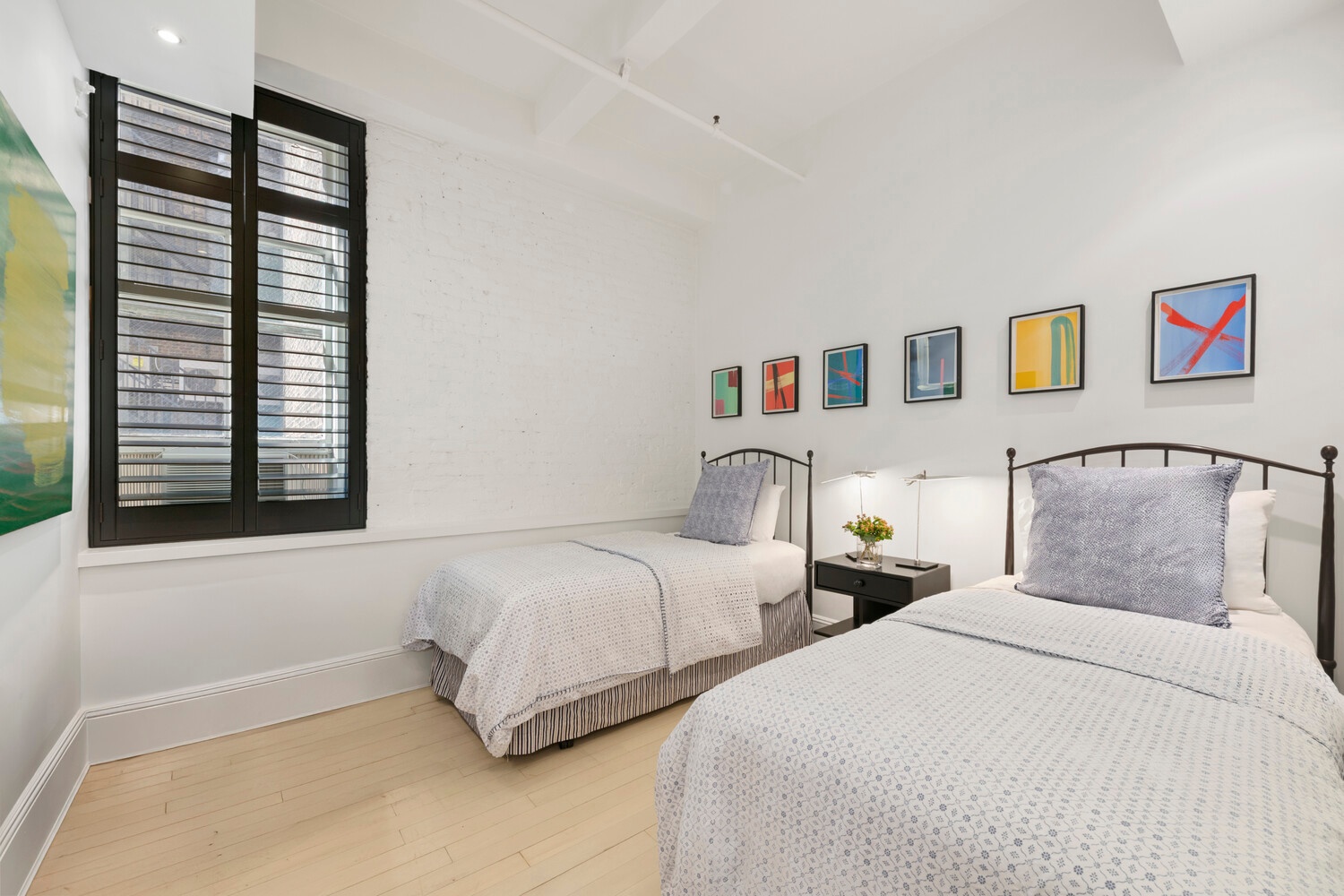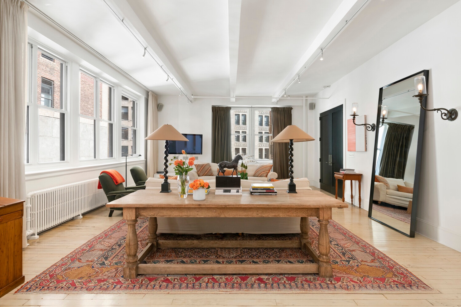 Residence 6R at The Holtz House offers 2,305 square feet of authentic Flatiron loft living with soaring 11-foot beamed ceilings, oversized windows, and triple exposures to the east, north, and west. Privately situated for exceptional tranquility, this residence is configured as a spacious two-bedroom and is convertible to a three-bedroom.