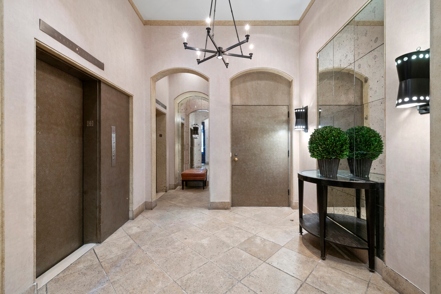 The primary suite features a custom walk-in closet and a spa-like en-suite bathroom, complemented by a spacious secondary bedroom. Generous storage is found throughout, including built-ins, multiple closets, and a locked storage room on the same floor shared with only one other residence. A washer/dryer and filtered water system further enhance the home.