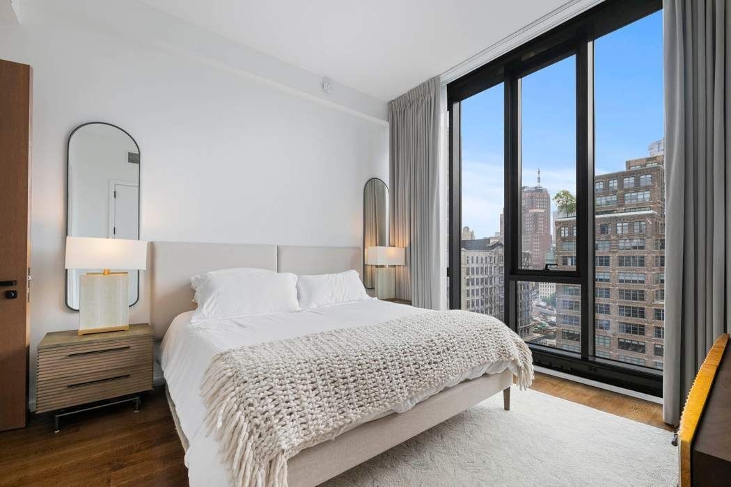 The king-sized primary bedroom is a true retreat, offering uninterrupted southern exposure and a bespoke walk-in closet with built-in storage solutions. The en-suite bathroom is finished in floor-to-ceiling marble and features a double vanity, oversized walk-in shower, and white marble herringbone flooring with radiant heat—designed to evoke a spa-like experience. The second and third bedrooms are equally considered, each with custom automatic shades, floor-to-ceiling windows, and peaceful quiet exposure facing North—ideal for guest suites, home office, or den.
