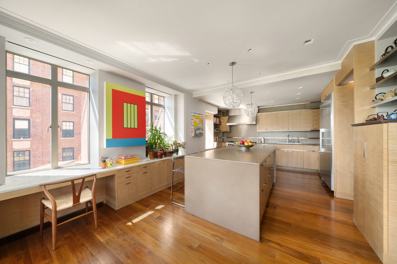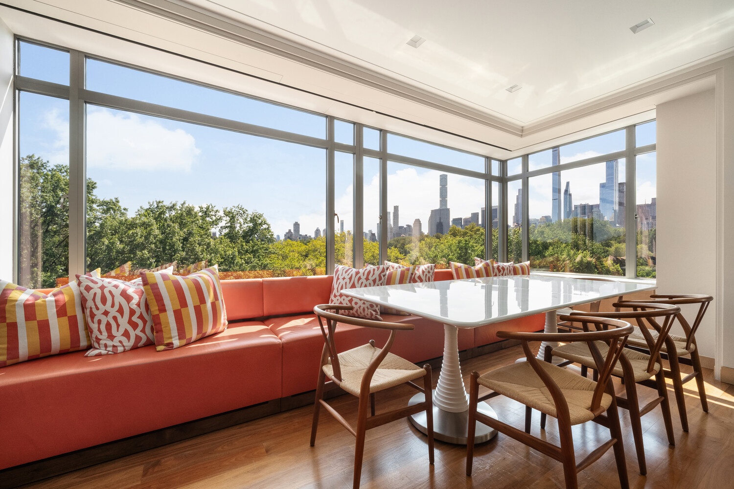 The chef's kitchen features a banquette overlooking Central Park and enjoys breathtaking eastern and southern views, with sun-drenched vistas stretching all the way down to Columbus Circle. It is outfitted with top-of-the-line appliances, including a 48-inch BlueStar range with vented hood, Miele microwave, Miele dishwasher, 15-inch Marvel wine fridge, Miele 48-inch refrigerator, and SubZero refrigerator and freezer drawers. With its casual dining space and exceptional natural light, this area truly forms the heart of the home.