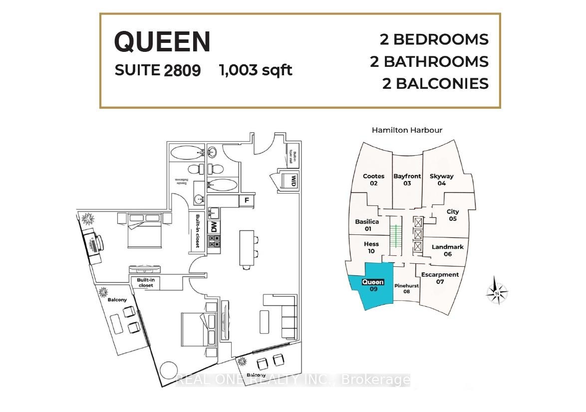 Marquee Residence Is One Of The Most Sought-After Luxury Condo Buildings In The Heart Of Downtown Hamilton A Modern, 5-Year-New Landmark And The Second-Tallest Building In The City. This 1007 sqft Spacious Two-Bedroom Corner Unit On The 28th Floor Offers Two Oversized Balconies With Unobstructed South And West Views Overlooking The Escarpment And The Lake. A Sleek Kitchen Featuring A Central Island, Quartz Countertops, Backsplash, European-designed Custom Cabinetry And Stainless-Steel Appliances. Vinyl Flooring Throughout. Two Bright Bedrooms With Built-In Closet Organizers, And Large Windows That Fill The Home With Abundant Natural Light. In-Suite Laundry Included. Residents Enjoy Top-Notch Amenities, Including A Gym, Yoga Studio, Two Party Rooms,Complete With Kitchenette, Lounge Chairs, Fireplace And Billiards Table, And An 8th-Floor Outdoor Terrace Ideally Located Just One Block From Hess Village, Nations Supermarket, Samir Supermarket, Jackson Square, And The New McMaster Family Practice. HSR And GO Bus Stops Are Right At Your Doorstep. Close To McMaster Children's Hospital, St. Joseph's Healthcare Centre, And Hamilton General Hospital. No Smoking Building. Other Units With Various Sizes And Layouts Are Also Available, Offering Sweeping Views Of The Waterfront, Escarpment, And Downtown Skyline. Indoor Parking Available at $150/Month. Available Immediately. Flexible Possession.