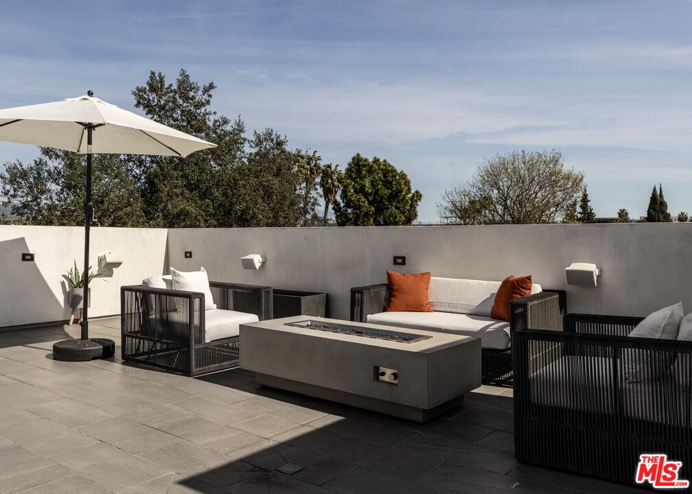 Few homes command such architectural significance at such an excellent price as this phenomenal, designer-done Beverly Grove rarity, a gated Control4 smart home in one of the very best neighborhoods of Los Angeles. A visual display of drought-tolerant flora creates soothing, varied texture that complements the clean geometric shape of this expertly crafted architectural, forming an exquisitely balanced design. Inside, every surface is thoughtful, every moment curated. Guests arrive to find pops of lush greenery through walls of glass alongside elegant accent walls and high-end finishes. Large stone tile floors flow from the foyer and formal dining, accented by globes of illuminated glass, and into the open-concept entertaining spaces of the main floor. Accent walls abound. The formal living room is highlighted by a commanding bookmatched fireplace as its centerpiece, flanked by panels of natural wood. The kitchen, its own understated culinary delight, echoes this same richness, with smooth floating cabinetry set against a grigio limewash backsplash and chef-grade Miele appliances. Upstairs, discover en-suite bedrooms with their own dedicated terraces and balconies, including a lavish spa-inspired primary bathroom with floating dual-sink vanity, smart mirrors, double-size shower, and soaking tub aside frosted glass. A walk-in closet includes custom built-ins for optimal organization. Each bedroom is thoughtfully appointed to maximize comfort, pleasure, and creative thought, and an office allows solitude for quiet study. In the backyard, relax poolside and lounge in the outdoor living room or enjoy the saltwater pool beneath blue California skies. A sprawling rooftop deck is the perfect space for hosting intimate gatherings, with full barbecue, fire pit, and 360-degree views of treetops, mountains, and vast cityscape. Welcome to a fresh, fantastic lifestyle central to museums, parks, fine dining, and nightlife, just moments to The Grove, Original Farmers Market, the Beverly Center, Beverly Hills, and the Westside.