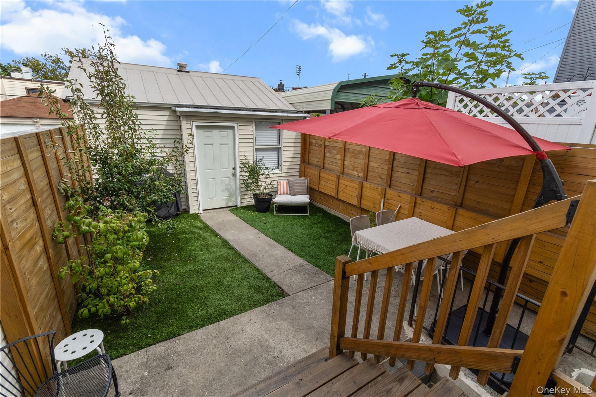 - Fenced backyard featuring outdoor dining area