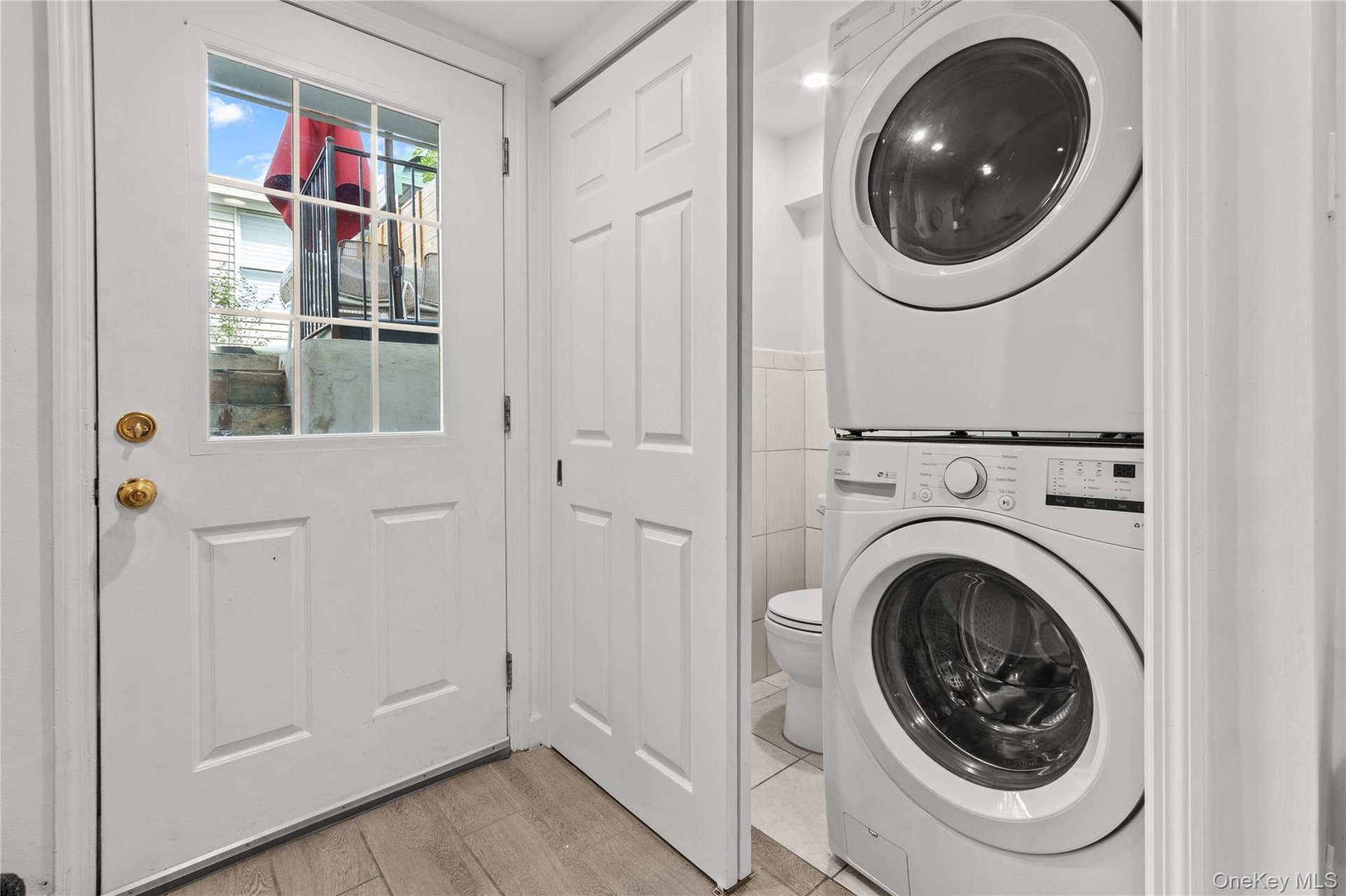 - Laundry room with estacked washer and dryer and light wood finished floors