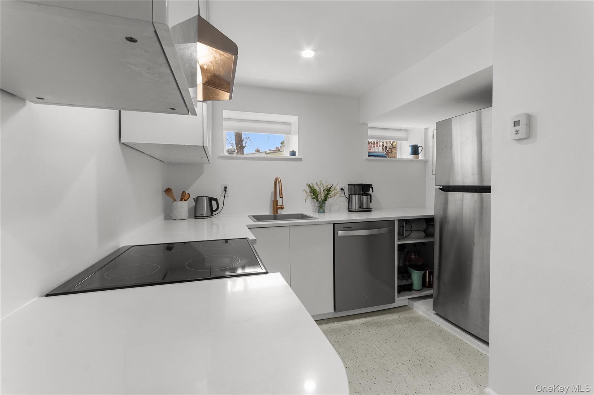 - Kitchen featuring stainless steel appliances, white cabinets, recessed lighting, light floors, and modern cabinets