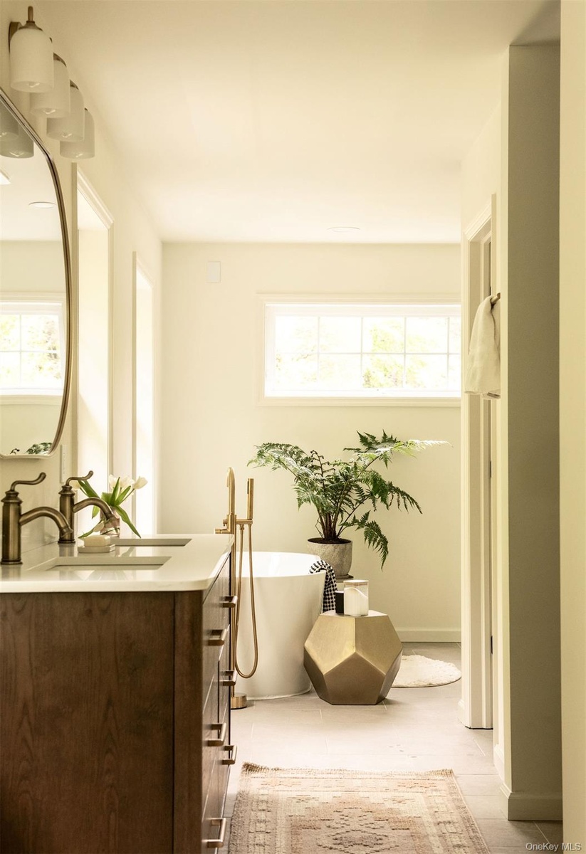- Full bathroom with vanity, a soaking tub, and light tile patterned floors