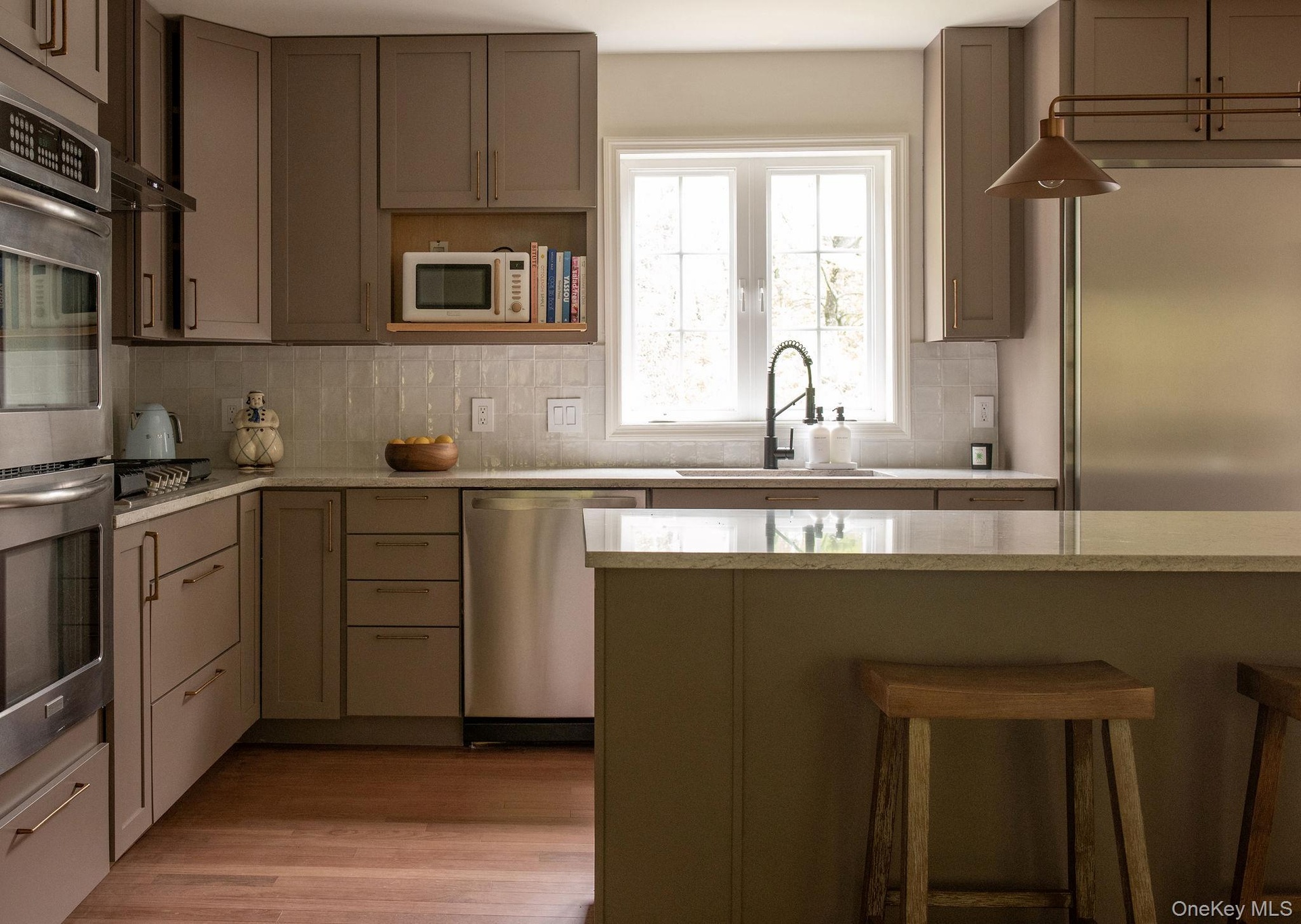 - Kitchen with stainless steel appliances, backsplash, light stone countertops, and light wood finished floors