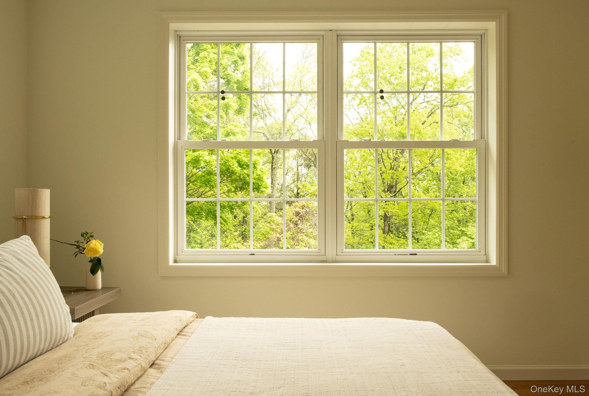 Upstairs, each bedroom looks out to the woods and feels equally private and calm. The expensive primary suite is a true retreat, its windows framing the changing colors of the landscape, green and luminous in summer, gold in autumn and crystalline in winter. Complete with double vanity, separate water closet, glass-and-tile shower, luxurious soaking tub and walk-in closet, the primary suite creates a measured rhythm of calm and a space that feels both composed and deeply restorative.