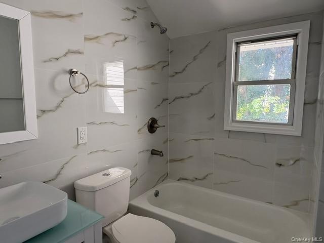 - Full bath featuring shower / tub combination, vanity, and vaulted ceiling
