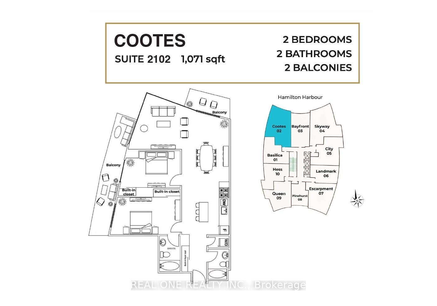 DescriptionMarquee Residence Is One Of The Most Sought-After Luxury Condo Buildings In The Heart Of Downtown Hamilton A Modern, 5-Year-New Landmark And The Second-Tallest Building In The City. This 1071 sqft Spacious Two-Bedroom Corner Unit On The 21st Floor Offers Two Oversized Balconies With North And West Views Overlooking The Escarpment And The Lake. A Sleek Kitchen Featuring A Central Island, Quartz Countertops, Backsplash, European-designed Custom Cabinetry And Stainless-Steel Appliances. Vinyl Flooring Throughout. Two Bright Bedrooms With Built-In Closet Organizers, And Large Windows That Fill The Home With Abundant Natural Light. In-Suite Laundry Included. Residents Enjoy Top-Notch Amenities, Including A Gym, Yoga Studio, Two Party Rooms,Complete With Kitchenette, Lounge Chairs, Fireplace And Billiards Table, And An 8th-Floor Outdoor Terrace Ideally Located Just One Block From Hess Village, Nations Supermarket, Samir Supermarket, Jackson Square, And The New McMaster Family Practice. HSR And GO Bus Stops Are Right At Your Doorstep. Close To McMaster Children's Hospital, St. Joseph's Healthcare Centre, And Hamilton General Hospital. No Smoking Building. Other Units With Various Sizes And Layouts Are Also Available, Offering Sweeping Views Of The Waterfront, Escarpment, And Downtown Skyline. Indoor Parking Available at Extra $150/Month. Available Immediately. Flexible Possession.Virtual Tour: https://youtu.be/MoC2rW5-Lb0Amenities- Carpet Free