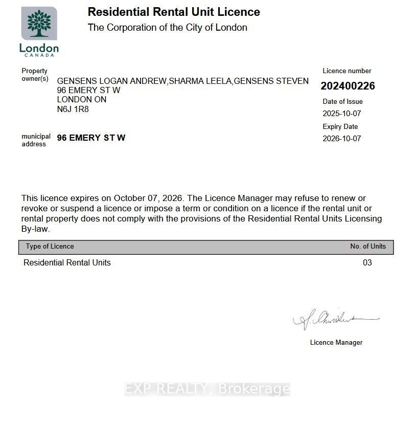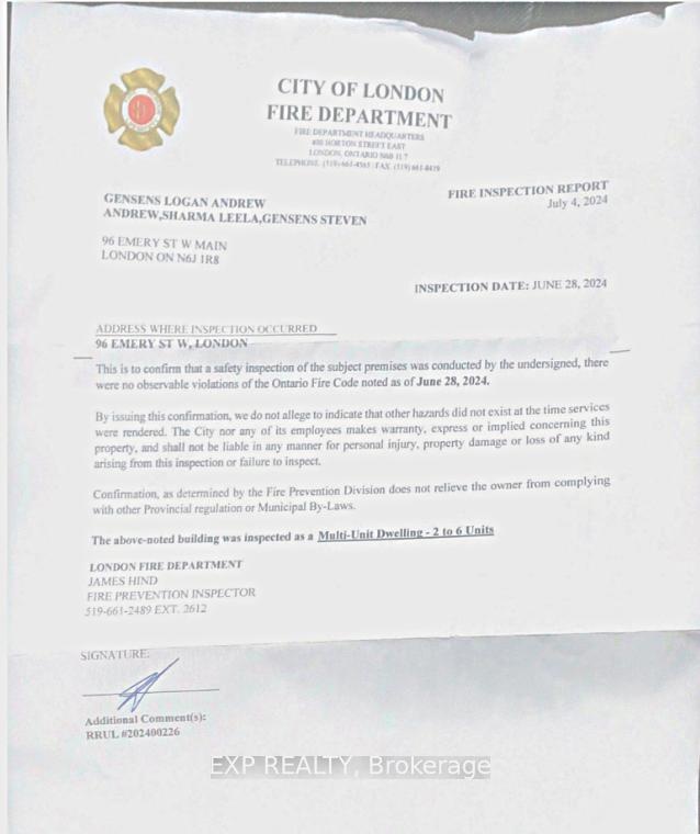 DescriptionThis legal triplex with rental license in place is larger than it appears with big addition in the back and walk-out basement entrances, which features a bonus fourth suite. The main floor unit features 4 beds and 2 full baths, projected to be rented for $2575/month. The upper 1 bed and 1 bath unit is rented for $1295/month. The downstairs rear walk-out unit is rented for $1500/month and the other side access walk up basement suite is projected to be rented for $1300/month . This brings the cumulative rent to $6670/month. The very low property taxes ($241/month) grandfathered also helps with a projected Cap Rate of 8.6%+, projected net operating income (NOI) of over $60,000 annually. Over $150,000 was invested during the current ownership, with extensive upgrades on everything from brand new 200 amp electric panel, new flooring, interconnected fire separations, quartz countertops, tiled showers, upgarded HVAC with vents in all 5 bathrooms, cosmetic improvements of 2 bathrooms, and 3 completely renovated bathrooms. Property features triple wide driveway with room for a fourth car to park in tandem; offering an independent parking spot for each unit. The greenspace of the oversized deep backyard, features many mature trees and is fully fenced in. Energy efficient upgrades were also carried out, including a smart thermostat install and a new Central AC unit being added in 2025. Fire and safety improvements include sprinklers, egress windows, and fire doors. Manor Park, which is Old South adjacent is an excellent community, with direct transit access, great green spaces including Eustace Park/The Coves, and ample ammenities. This location is one bus to Western University, Fanshawe College, White Oaks Mall, Masonville Mall, Victoria Hospital, University Hospital and Downtown London.Amenities- Accessory Apartment