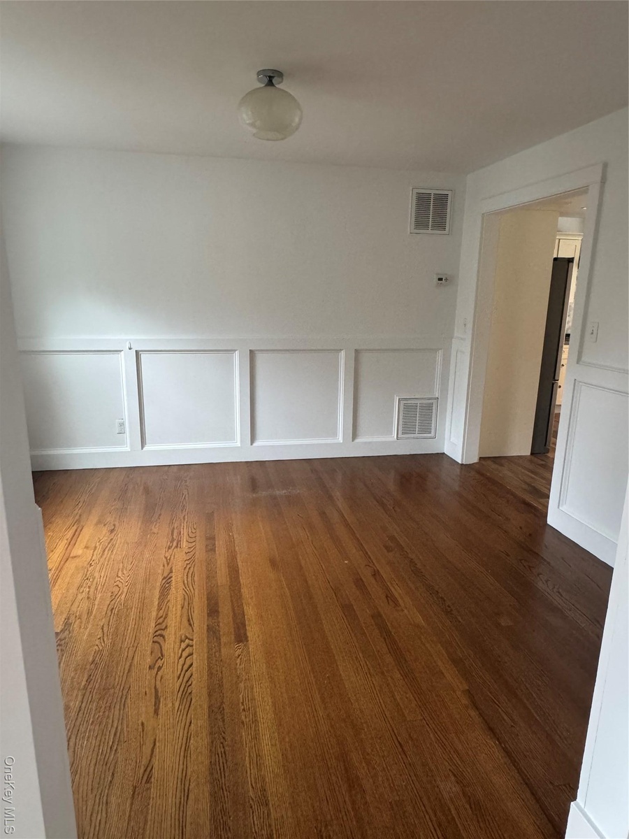 - Empty room featuring a decorative wall, dark wood-style flooring, and a wainscoted wall