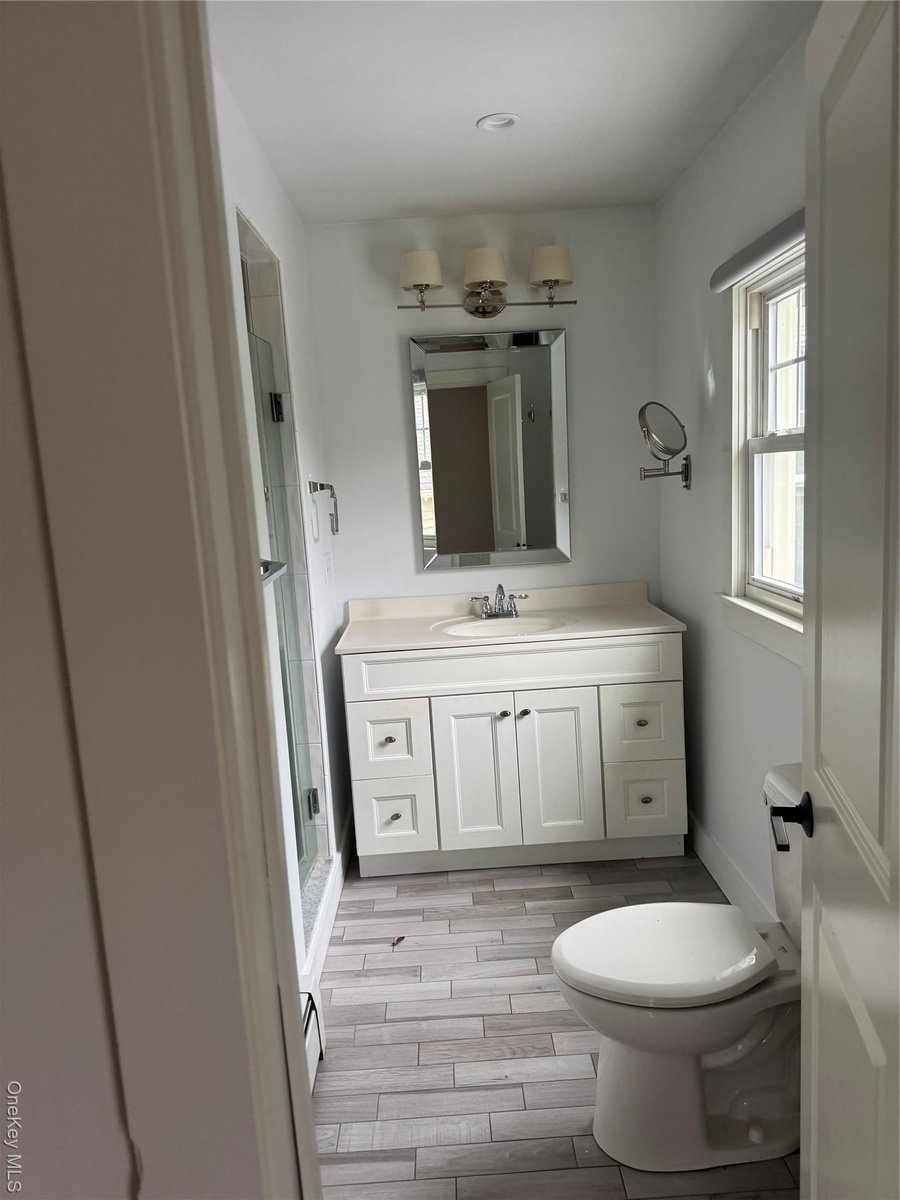 - Full bathroom featuring vanity, wood tiled floors, and a stall shower