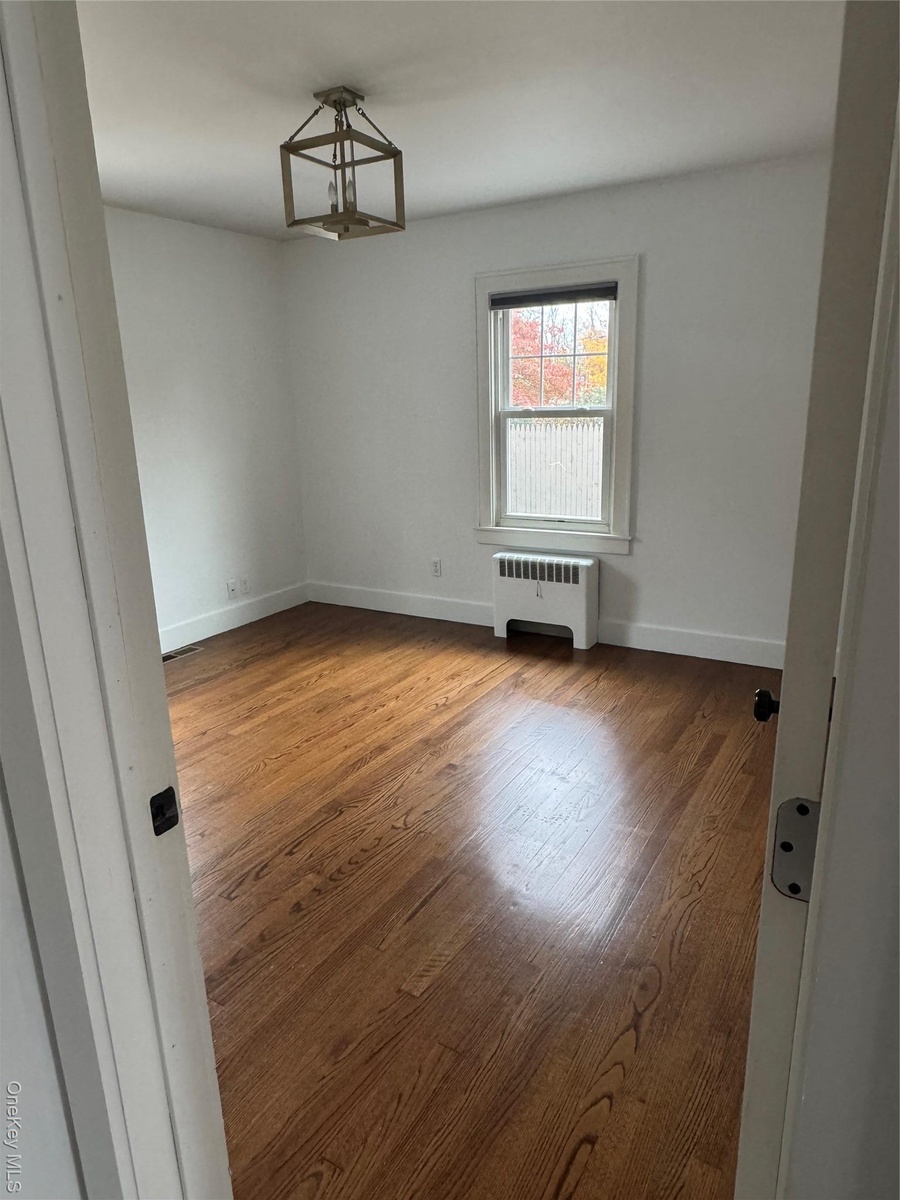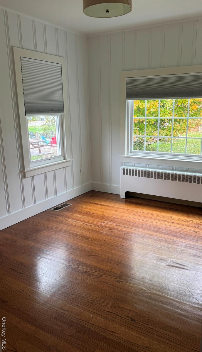 - Unfurnished room with wood finished floors and radiator heating unit