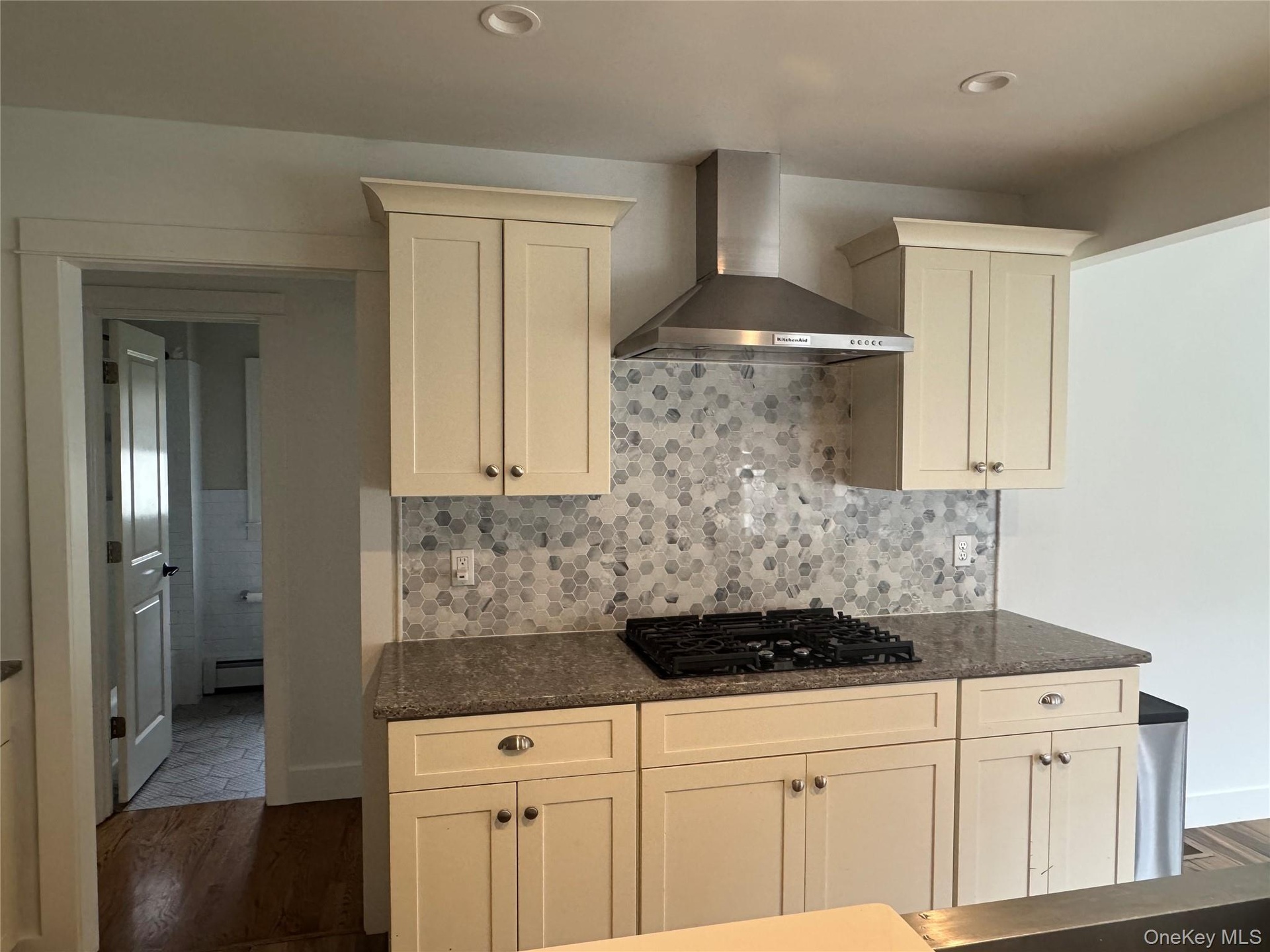 - Kitchen featuring wall chimney range hood, dark stone countertops, a center island with sink, recessed lighting, and radiator heating unit