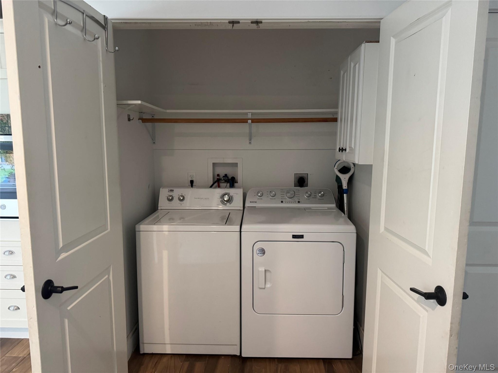 - Laundry area with dark wood-style flooring and independent washer and dryer
