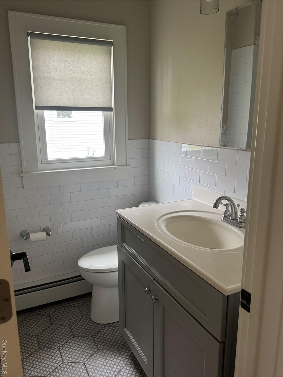 - Half bath with tile walls, a baseboard radiator, vanity, light tile patterned flooring, and wainscoting