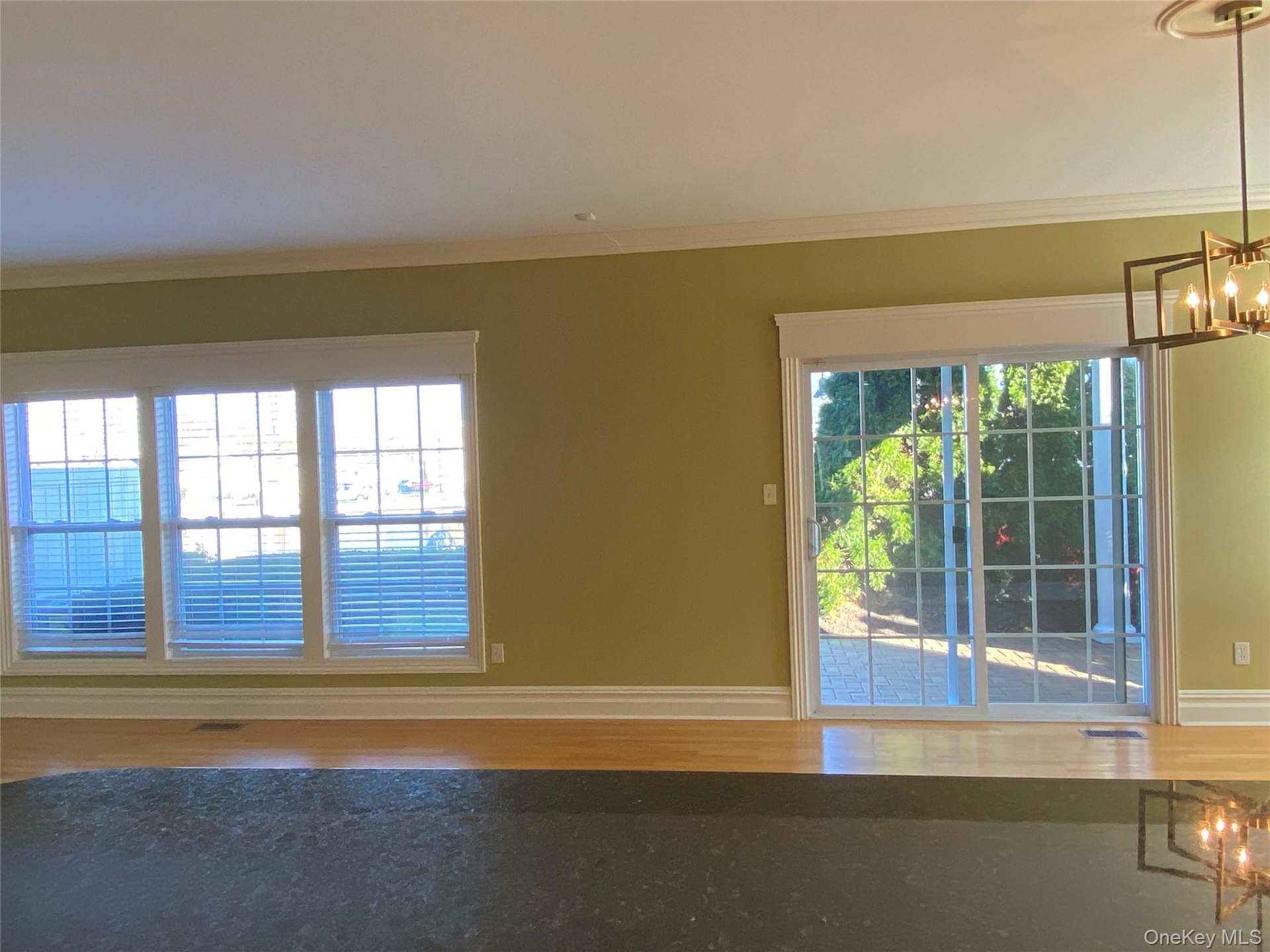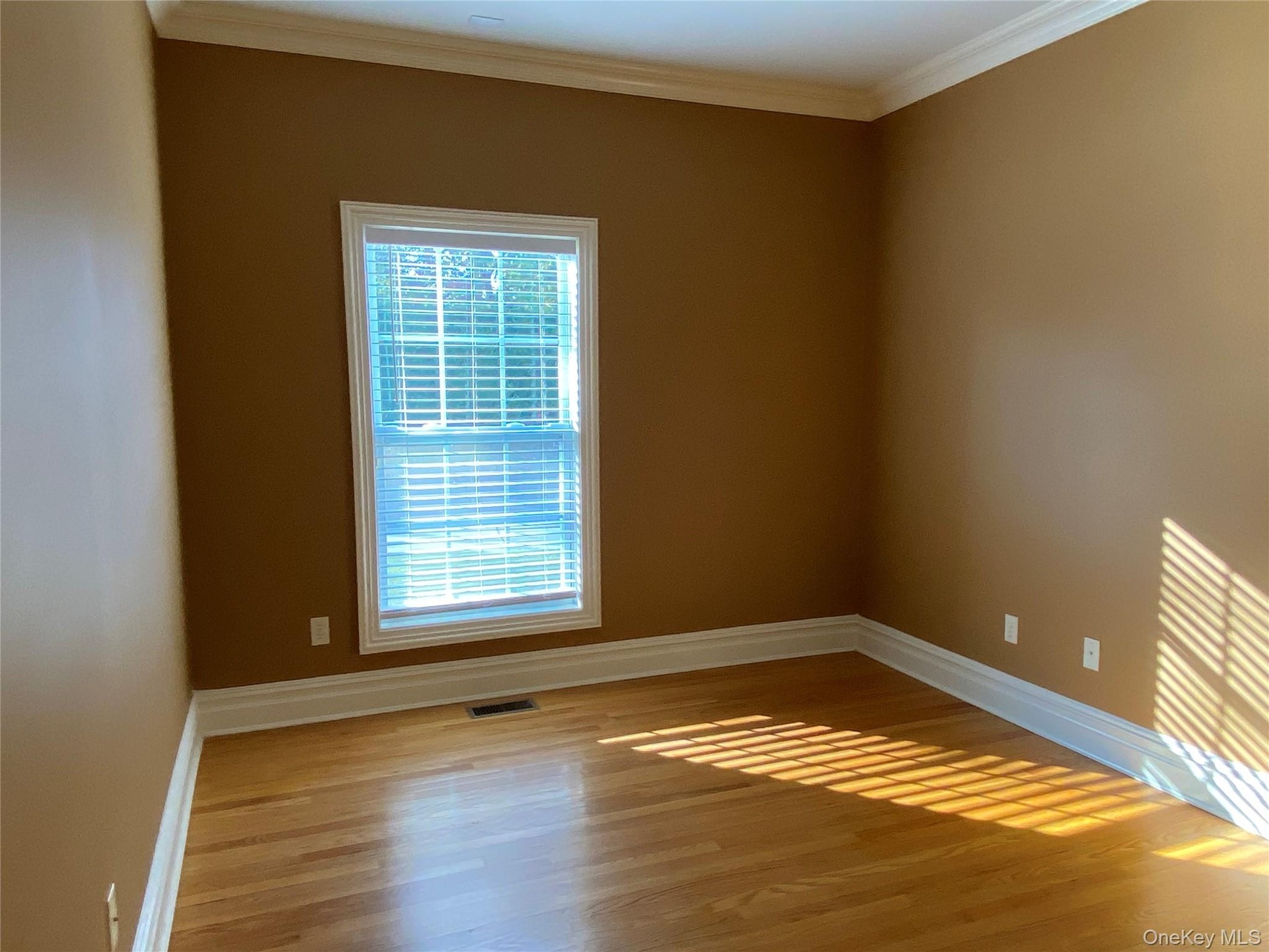 - Spare room featuring a chandelier, wood finished floors, and crown molding