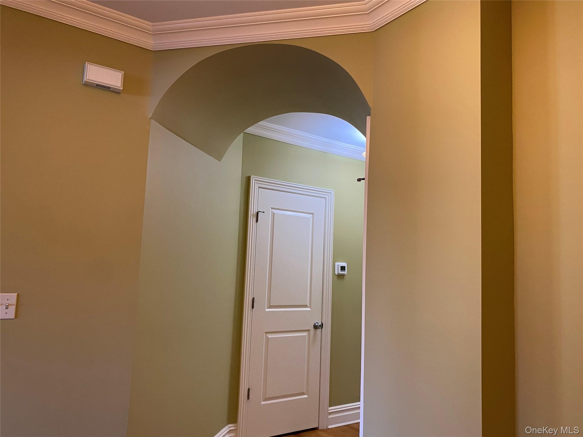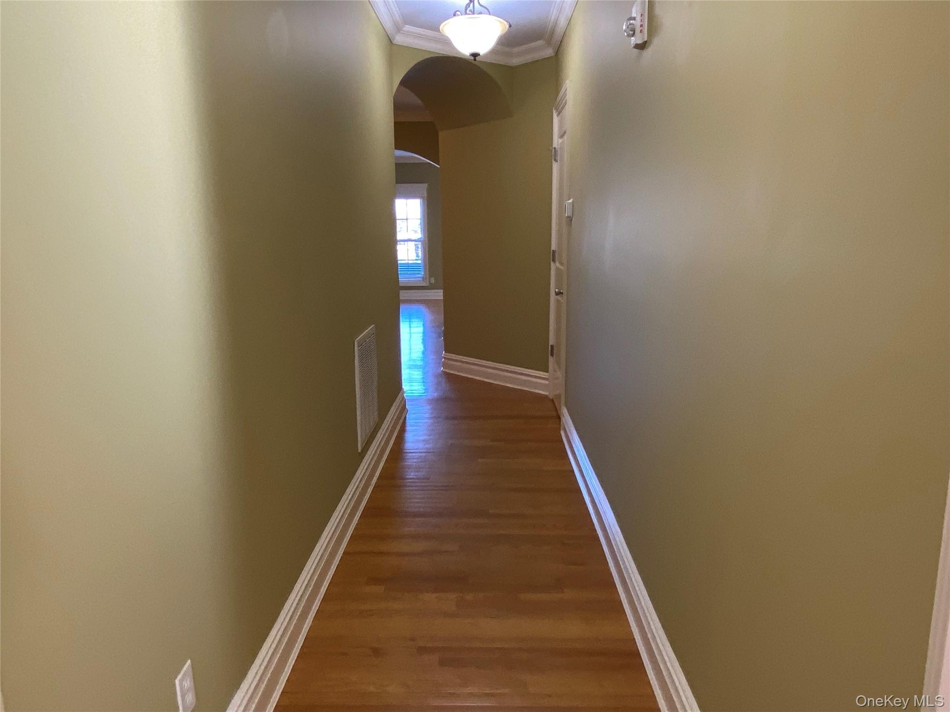 - Hallway with ornamental molding, wood finished floors, and arched walkways