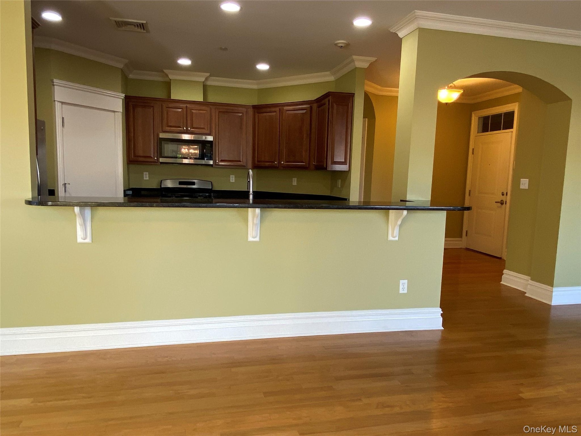 - Kitchen with a kitchen bar, arched walkways, dark wood-style floors, crown molding, and recessed lighting
