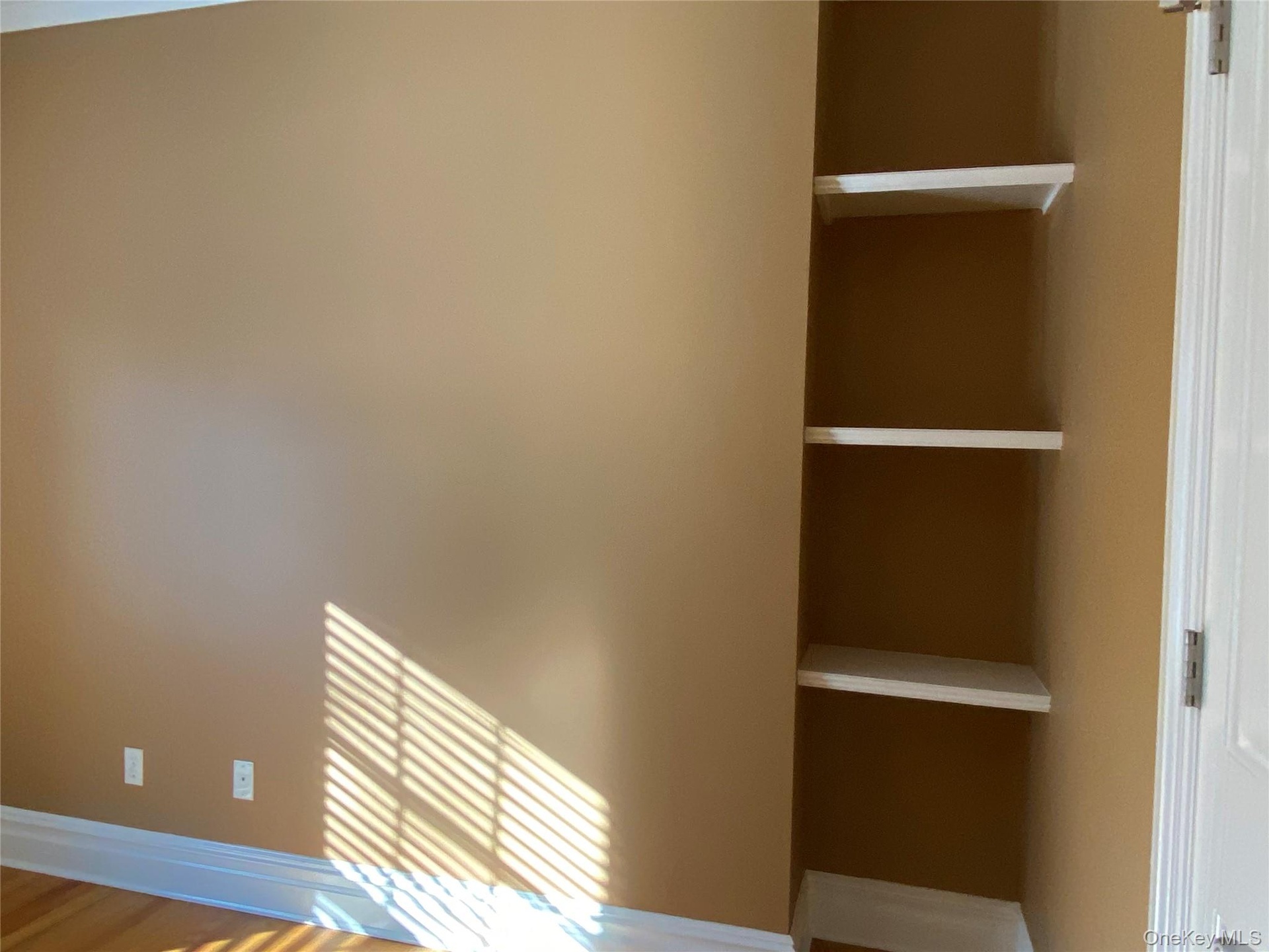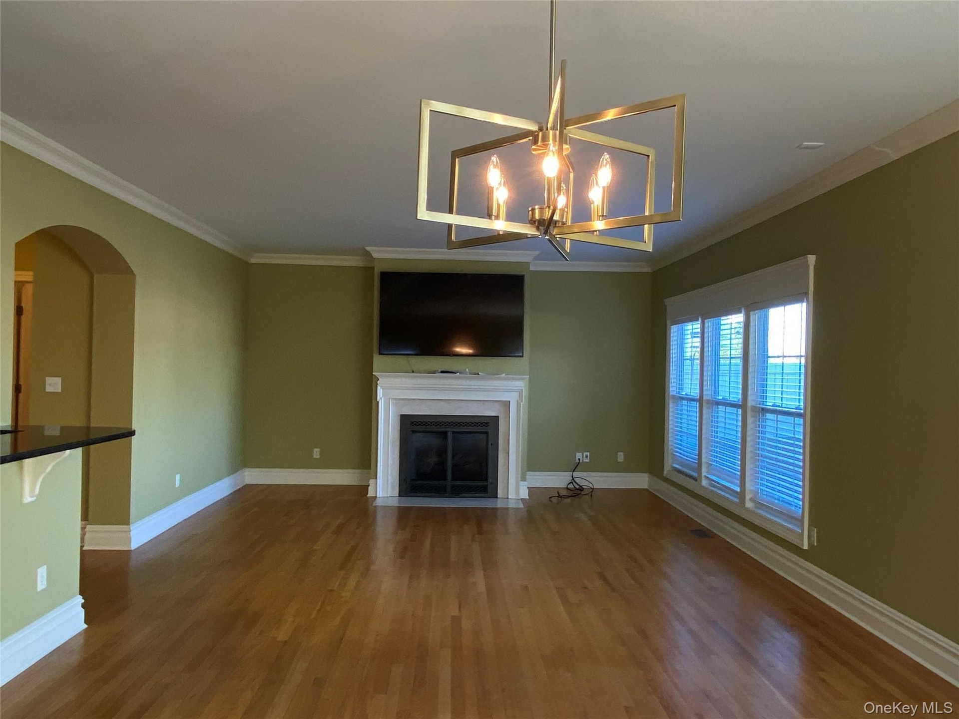 - Unfurnished living room with a fireplace with flush hearth, ornamental molding, and wood finished floors