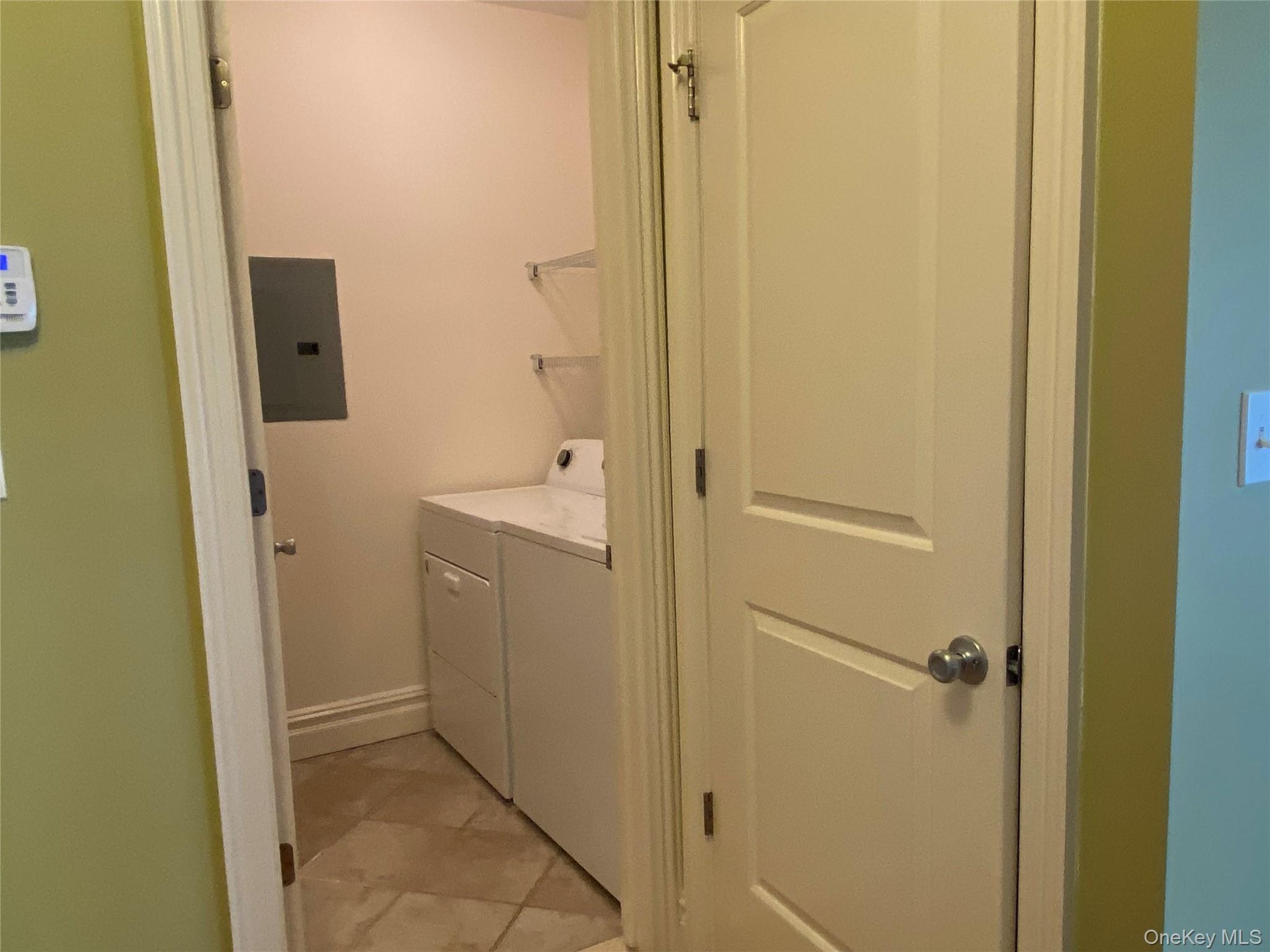 - Washroom with electric panel, independent washer and dryer, and light tile patterned floors