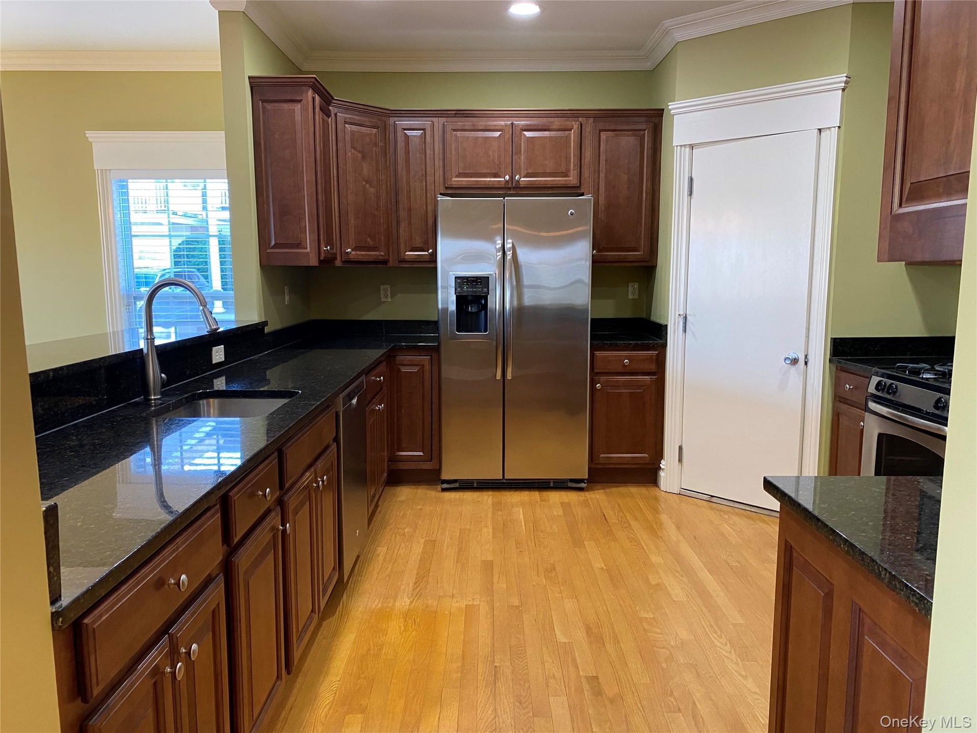 - Kitchen featuring stainless steel appliances, crown molding, light wood-style flooring, and dark stone countertops