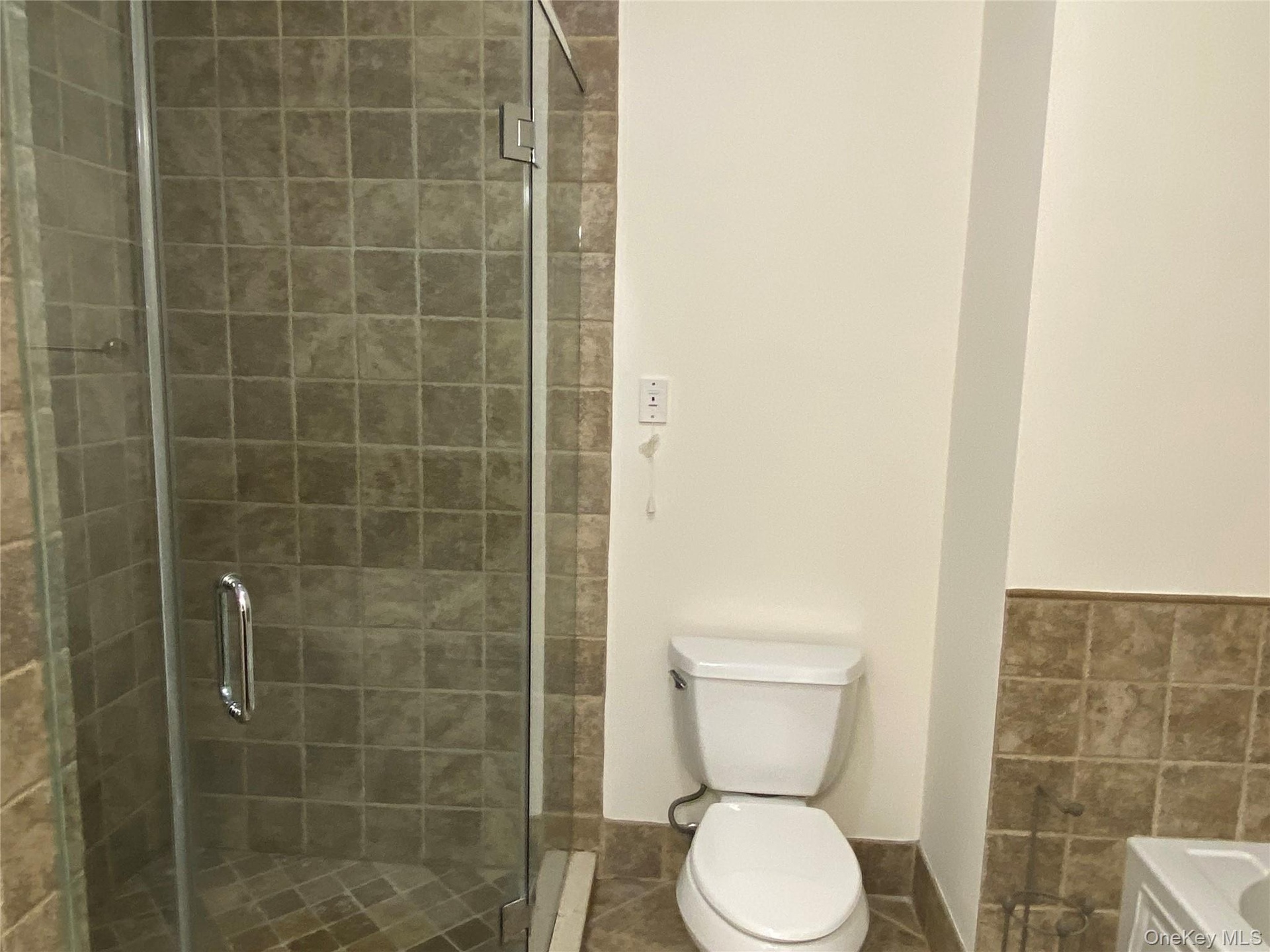 - Bathroom with a shower stall, tile patterned flooring, and tile walls