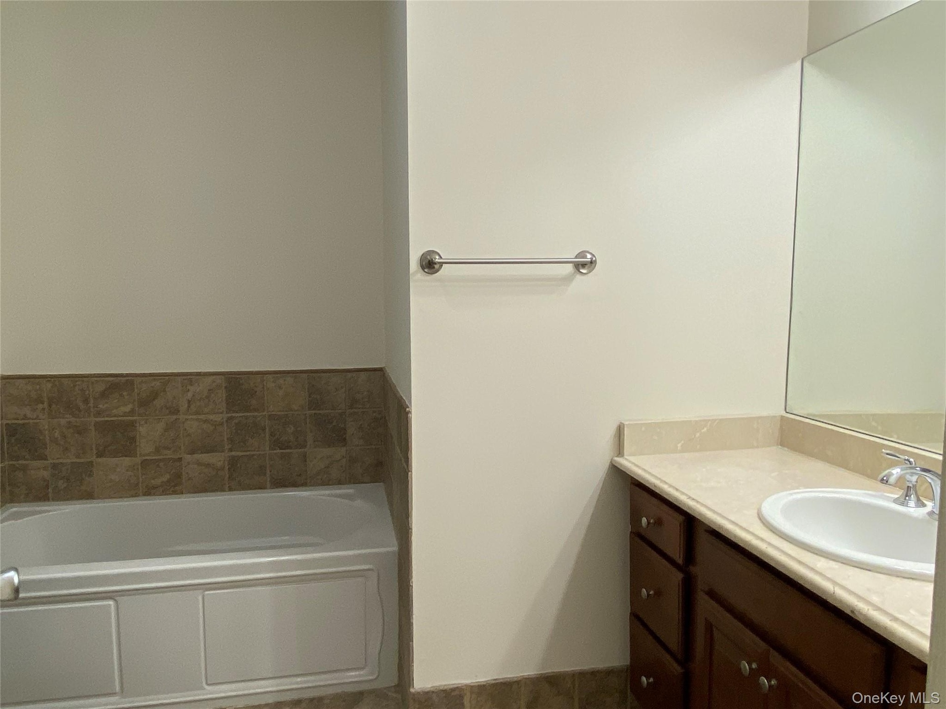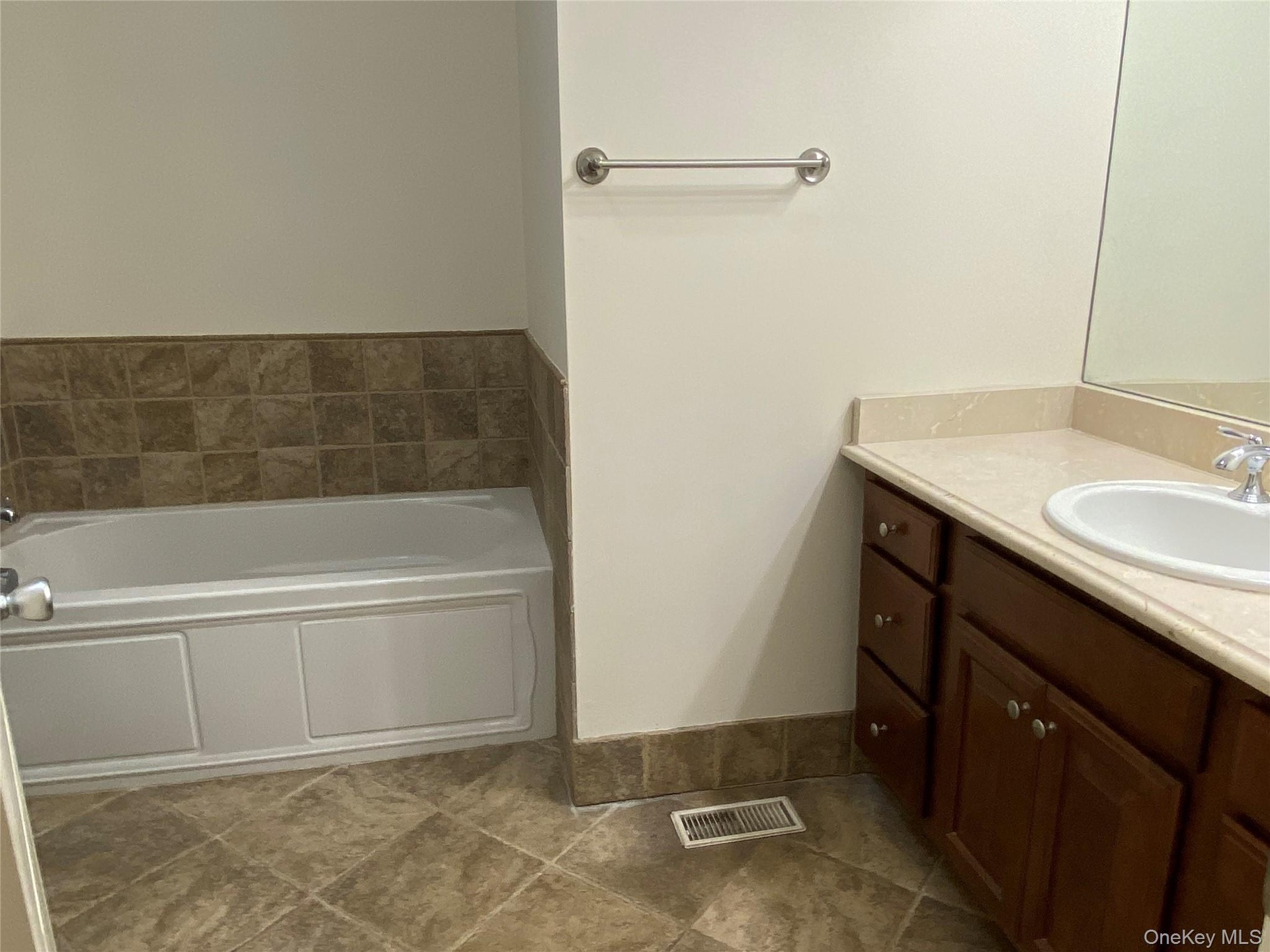 - Full bathroom featuring a garden tub, vanity, and light tile patterned floors