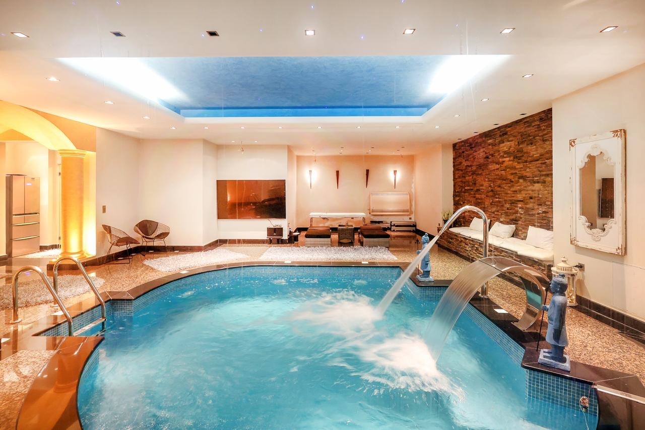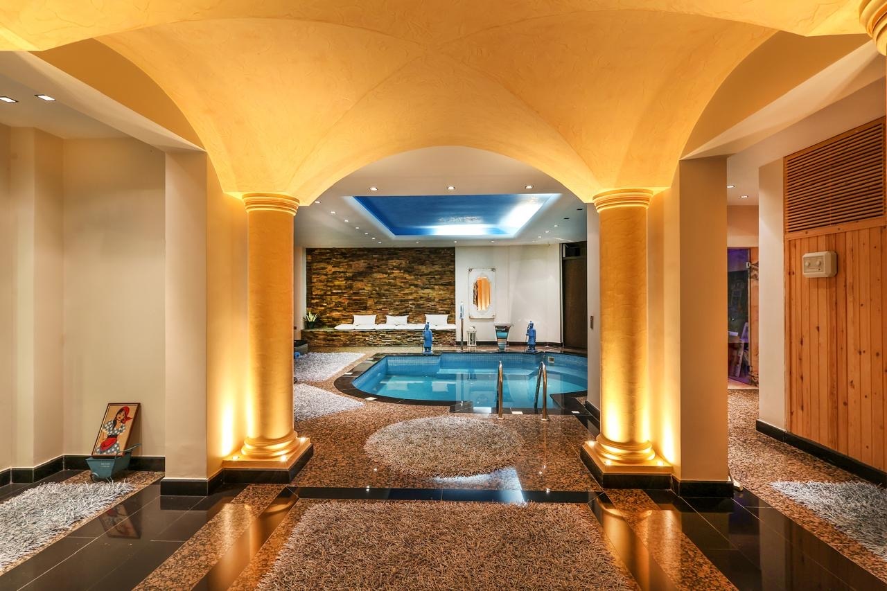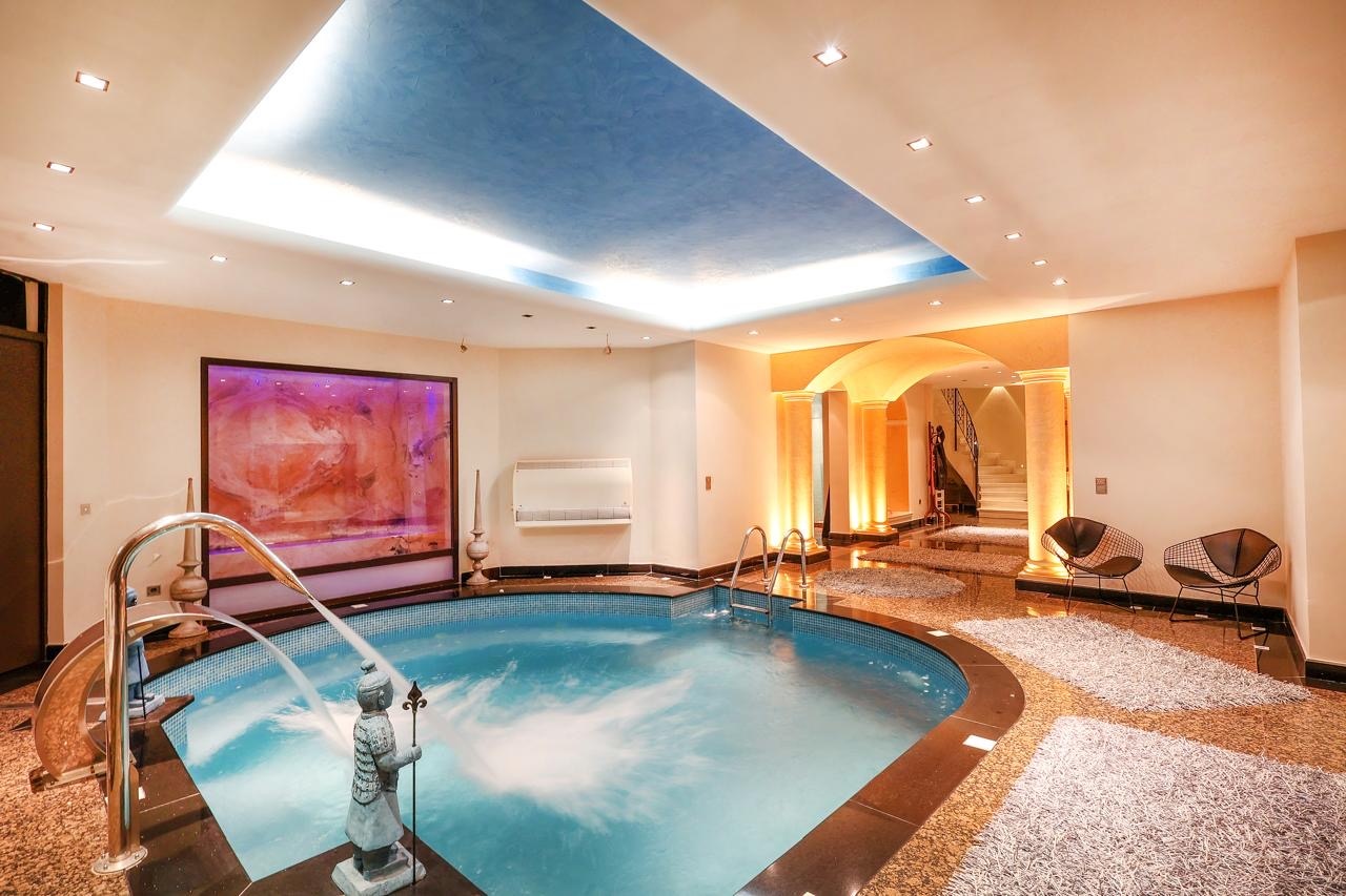 The lower level offers an indoor heated swimming pool, spa, hammam, and fitness area, creating a private retreat of relaxation and wellness.