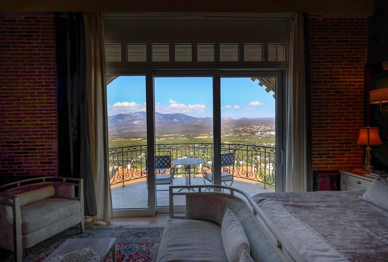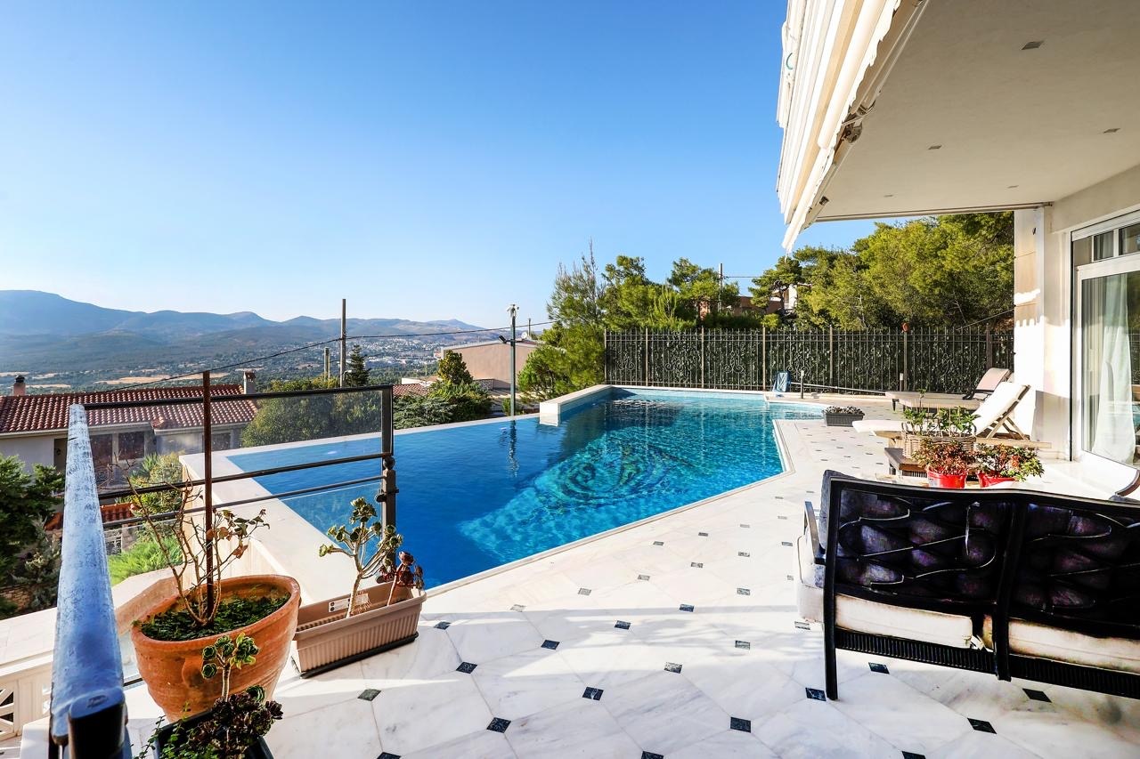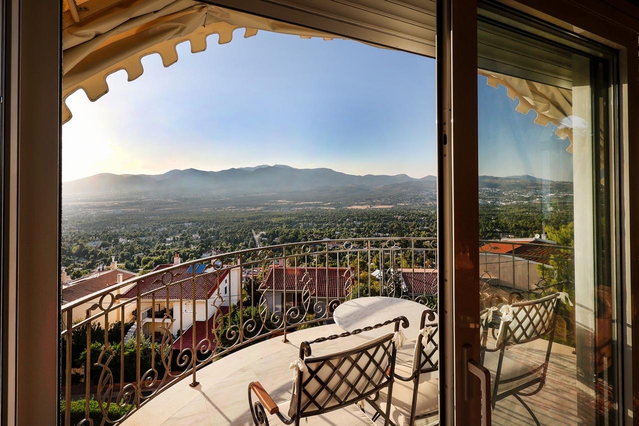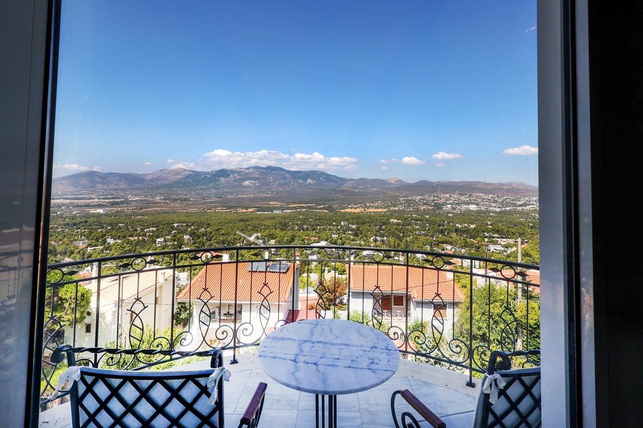 The main living spaces open onto sweeping balconies with panoramic views of Athens, Piraeus, and Mount Parnitha.