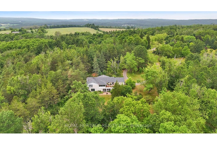 WATCH INCREDIBLE DRONE VIDEO! A long, tree-lined driveway leads to this private 27-acre estate; peaceful, secluded, and surrounded by nature. Never before offered for sale. this one-owner, custom-built brick bungalow offers over 3,500 sq. ft. of solid construction, designed for comfort and efficiency. Exterior built with solid concrete bricks - far more durable than standard clay bricks - it still looks new! Set high and dry with no sump required, the home features 400-amp hydro and a 3-ton heat pump, keeping total hydro and heating costs around $2,900 for 2024. The lower level includes a large family room with beam construction, a floor-to-ceiling stone fireplace, and an 8-foot-deep, kidney-shaped indoor swimming pool. The pool has not been used for some time and is currently empty; a pool company has inspected it and provided an estimate for bringing it back to full use. Water in pool pictures is virtually enhanced. Sliding doors on lower level open to a private patio, while the main level offers walkouts to a south-facing deck and a bright sunroom, ideal spaces for relaxing or entertaining. This exceptional estate offers privacy and space while being just minutes to Highways 407, 115, and 401, and close to Ganaraska Forest, Rice Lake, and Brimacombe Ski Hill. Only an hour to downtown Toronto, yet set in a quiet, natural setting. With an attached two-car garage and the benefit of the Managed Forest Tax Incentive, this is a well-built home in a great location, a rare opportunity to enjoy country living at its best. Home Inspection available on request.