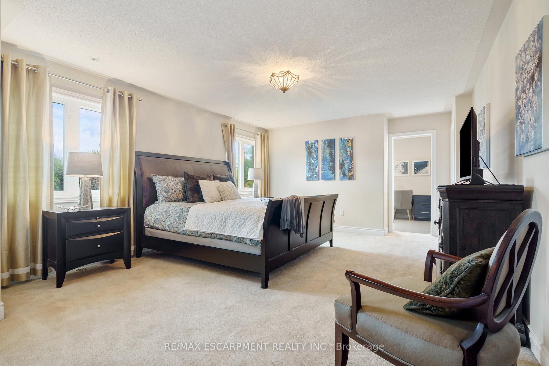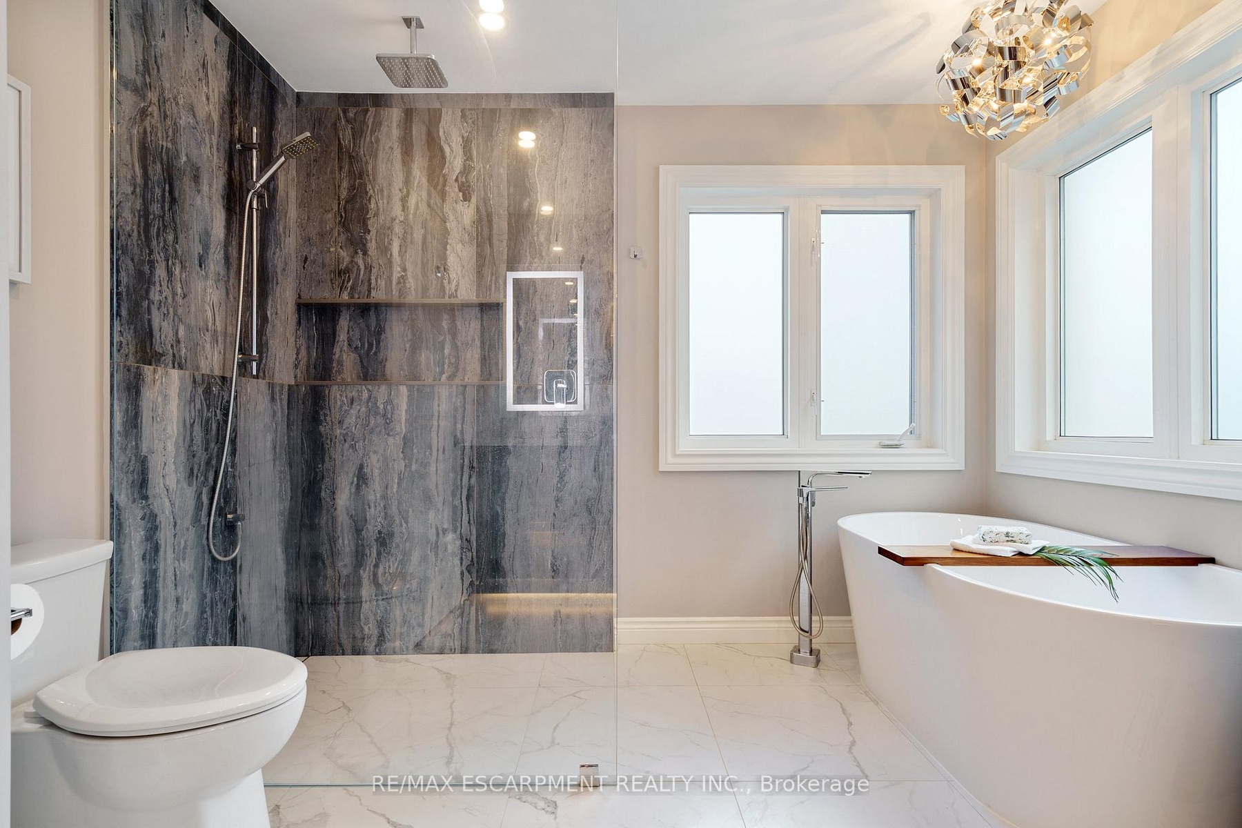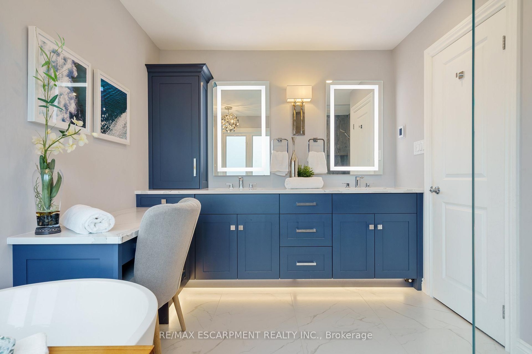 Welcome to this beautifully upgraded home in desirable Bronte Woods! Finished from top to bottom, this stunning property offers over 4,200 sq. ft. of luxurious living space, featuring 4 spacious bedrooms, 5 baths, a main floor den, and an incredible finished basement. Hardwood floors throughout the main level and a cathedral ceiling in the liv. rm, where a large picture window fills the space with natural light and overlooks greenspace. The renovated 2-piece powder room and large upgraded kitchen boast stainless steel appliances, including a built-in dishwasher, microwave, gas stove, and ice-making fridge. Nine-foot ceilings enhance the home's sense of openness and airiness. The bright, oversized family room features a gas fireplace and pot lights throughout. The main floor office is ideal for today's work-from-home lifestyle, while the renovated laundry/mudrm offers a stackable washer/dryer and convenient garage access. Solid wood staircase leads to the upper level, where you'll find a spacious principal suite with a sitting area, a gorgeous 5-pc reno'd ensuite with heated floors, under-cabinet lighting, illuminated mirror, glass shower, double sinks, and a freestanding slipper tub. The suite also includes a generous w/i closet. 3 additional large bedrooms complete this level, bedrms 2 and 3 share a semi-ensuite, and bedroom 2 features its own walk-in closet. The finished basement is an entertainer's dream, with wet bar, custom built-in cabinetry, exercise area, games room, and multiple storage spaces including a cold room. Recent upgrades: new window panes throughout, reshingled roof, new A/C, new front door, exterior light fixtures, upgraded attic insulation, and pot lights throughout. The private, fully fenced backyard features multi-level decks. Ideally located within walking distance to the lake, Sheldon Creek Trail Park, Creek Path Woods, Shell Park, and Nautical Park, and just minutes to Appleby GO, highways, top-rated schools, shopping.