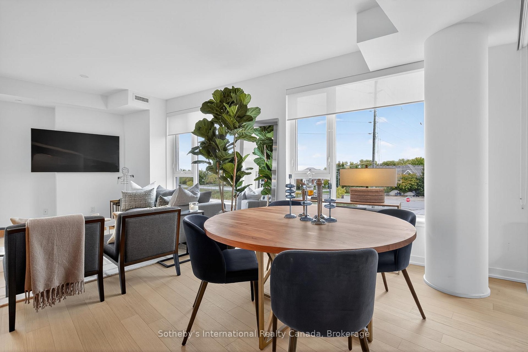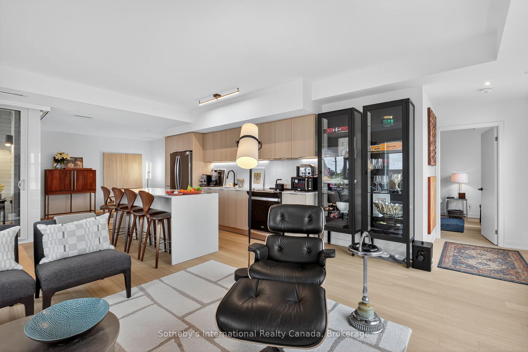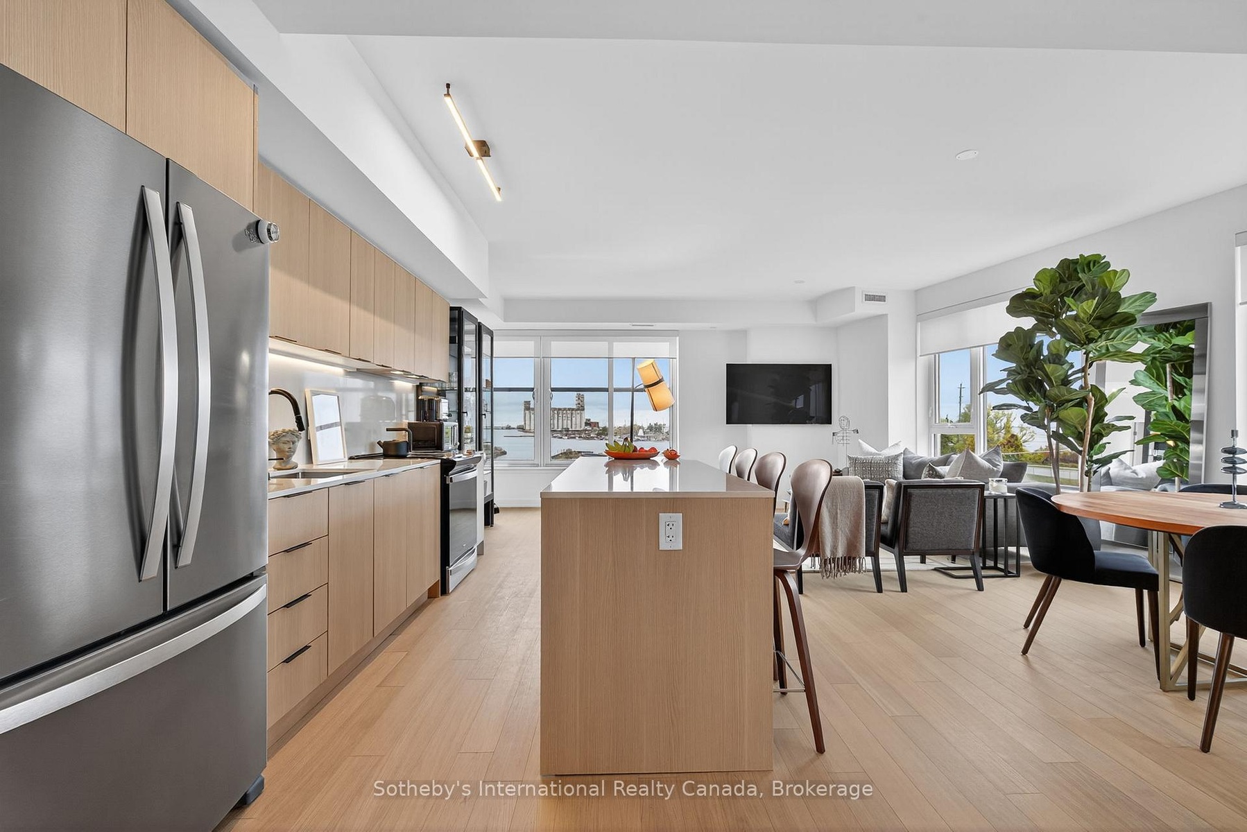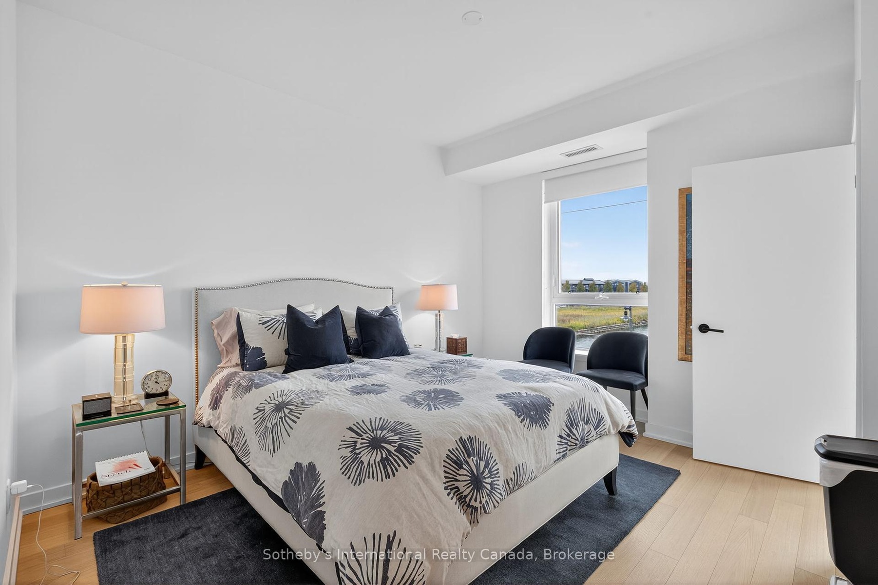 Luxury Waterfront Living in Collingwood. Welcome to this grand corner unit with panoramic views of Georgian Bay and ski hills, where floor-to-ceiling windows capture breathtaking sunrises and sunsets every day. Spanning 1,200 sq. ft. of customized living space, this residence is steps from the harbour and offers the ultimate blend of sophistication and lifestyle. Inside, you'll find wood and porcelain tile flooring throughout, and a large primary suite with a spa-like 5-piece ensuite with electric in-floor heating. The spacious den adds a layer of versatility, serving beautifully as a home office, guest suite, or both with a foldaway bed. Designer upgrades and a 100 sq. ft. covered terrace. Complete with two underground parking spaces one with EV charging and storage locker, this home redefines convenience. Indulge in resort-style amenities: guest suites, a pet spa, fitness studio, social lounge with water views, and a rooftop terrace. Surrounded by parkland and just a short stroll to historic downtown Collingwood's shops, dining, and festivals, you're also minutes from premier ski hills and golf clubs. This is more than a home its active luxury living at its finest.Taxes to be assessed.