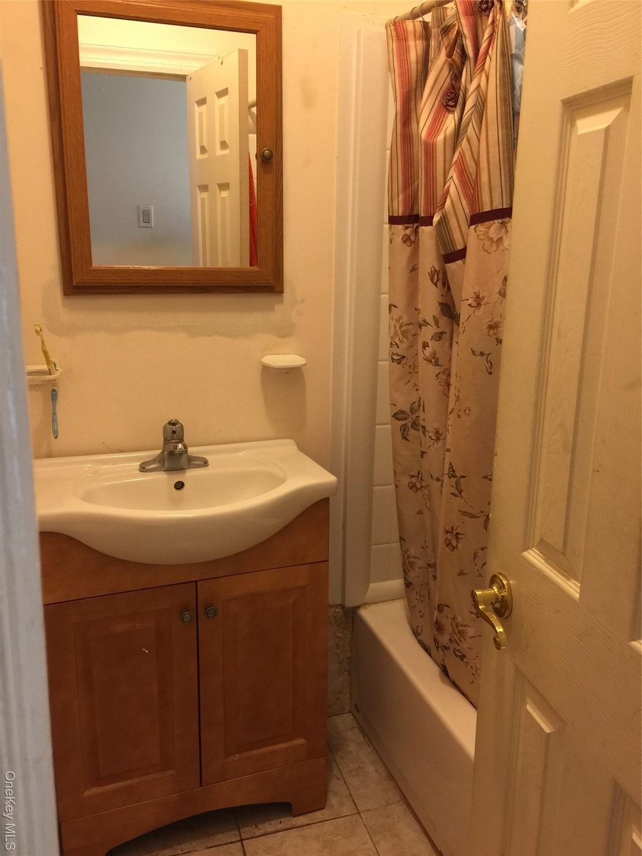 - Full bath featuring vanity, shower / bath combination with curtain, and light tile patterned floors
