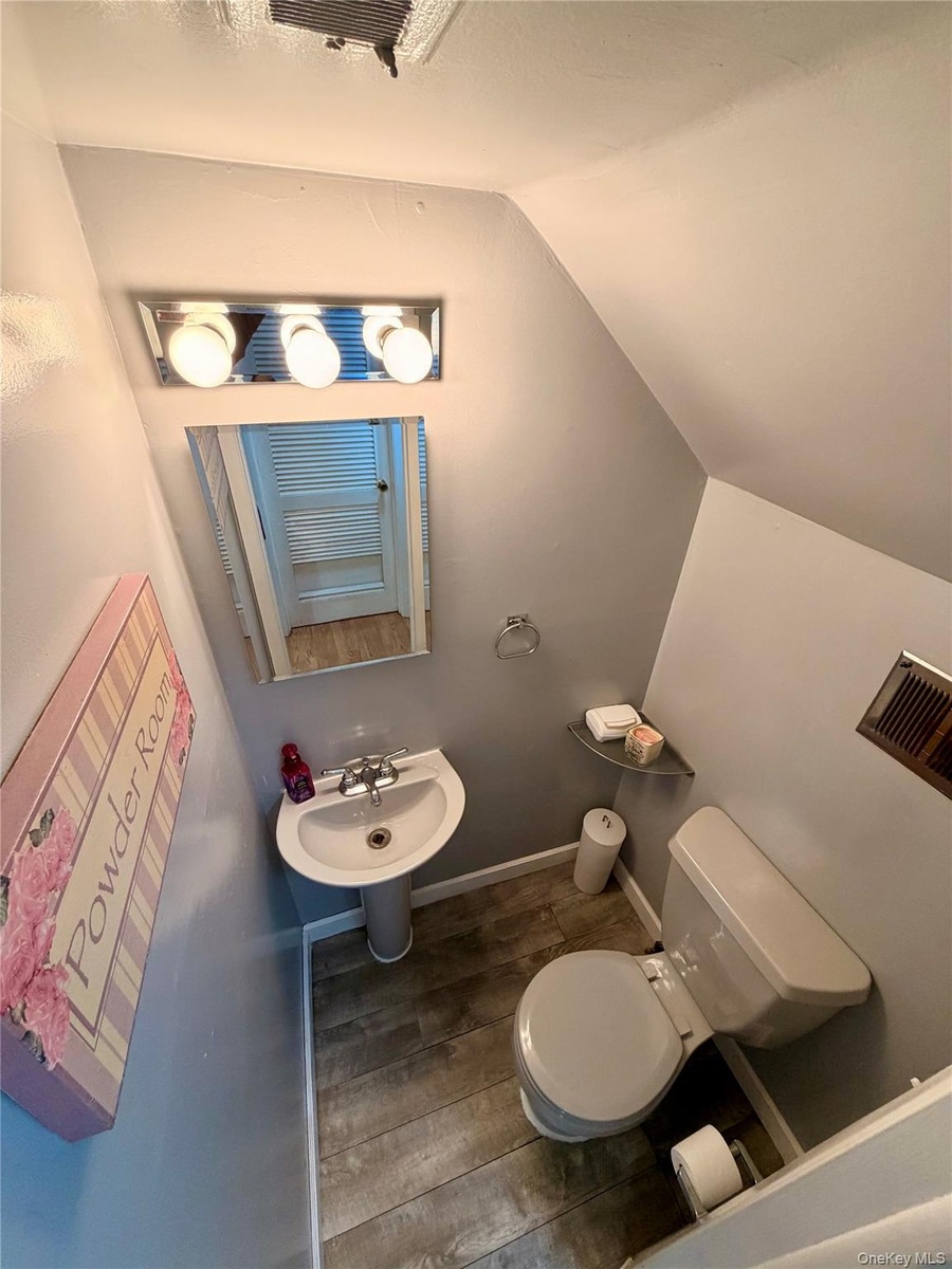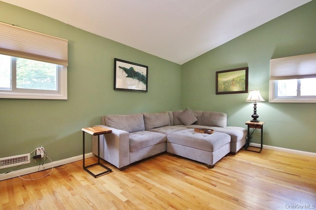 - Living area featuring light wood-style floors, lofted ceiling, and an office area