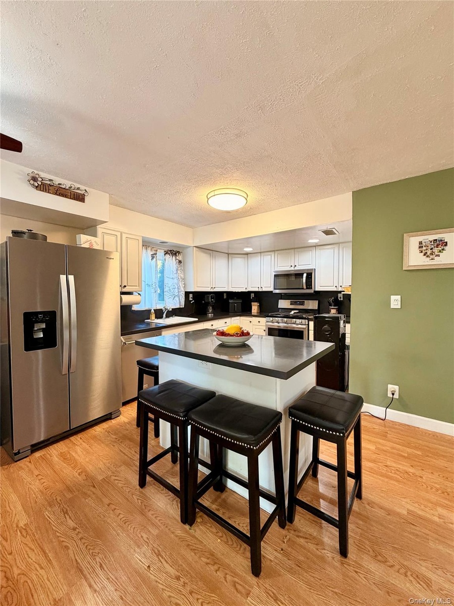 - Kitchen featuring a breakfast bar, stainless steel appliances, white cabinets, a center island, and a textured ceiling