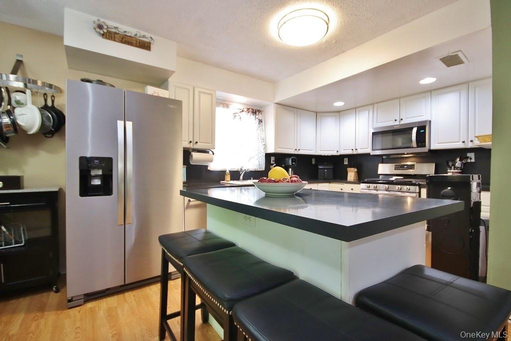 - Kitchen with a kitchen breakfast bar, stainless steel appliances, dark countertops, light wood-style flooring, and white cabinetry