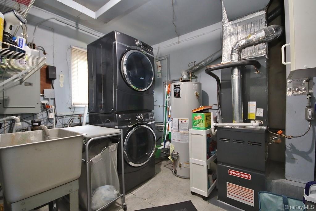 - Laundry room featuring stacked washer and clothes dryer, gas water heater, and heating unit