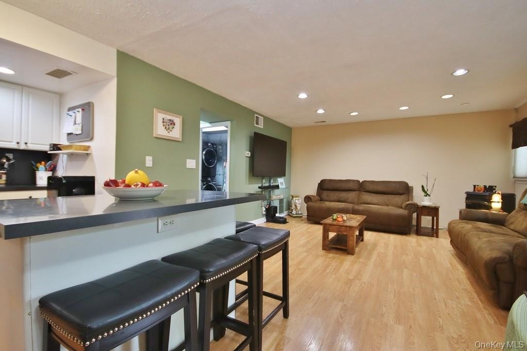 - Living area featuring light wood finished floors, recessed lighting, and stacked washer / dryer