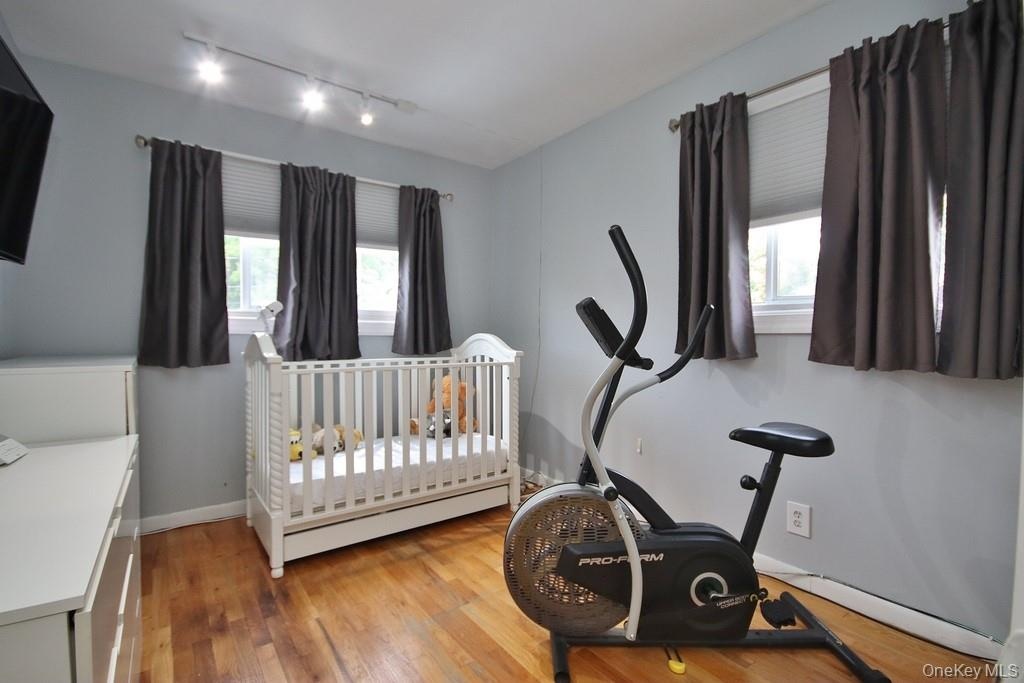 - Bedroom featuring rail lighting, light wood finished floors, and a crib